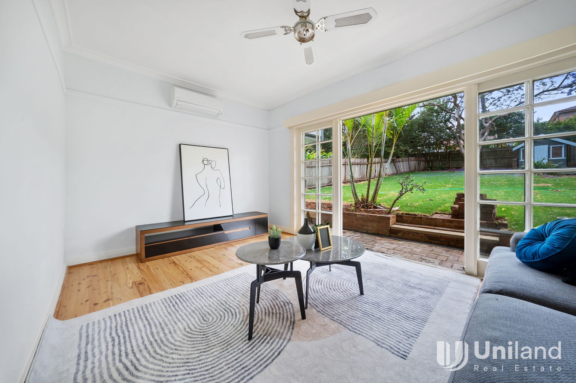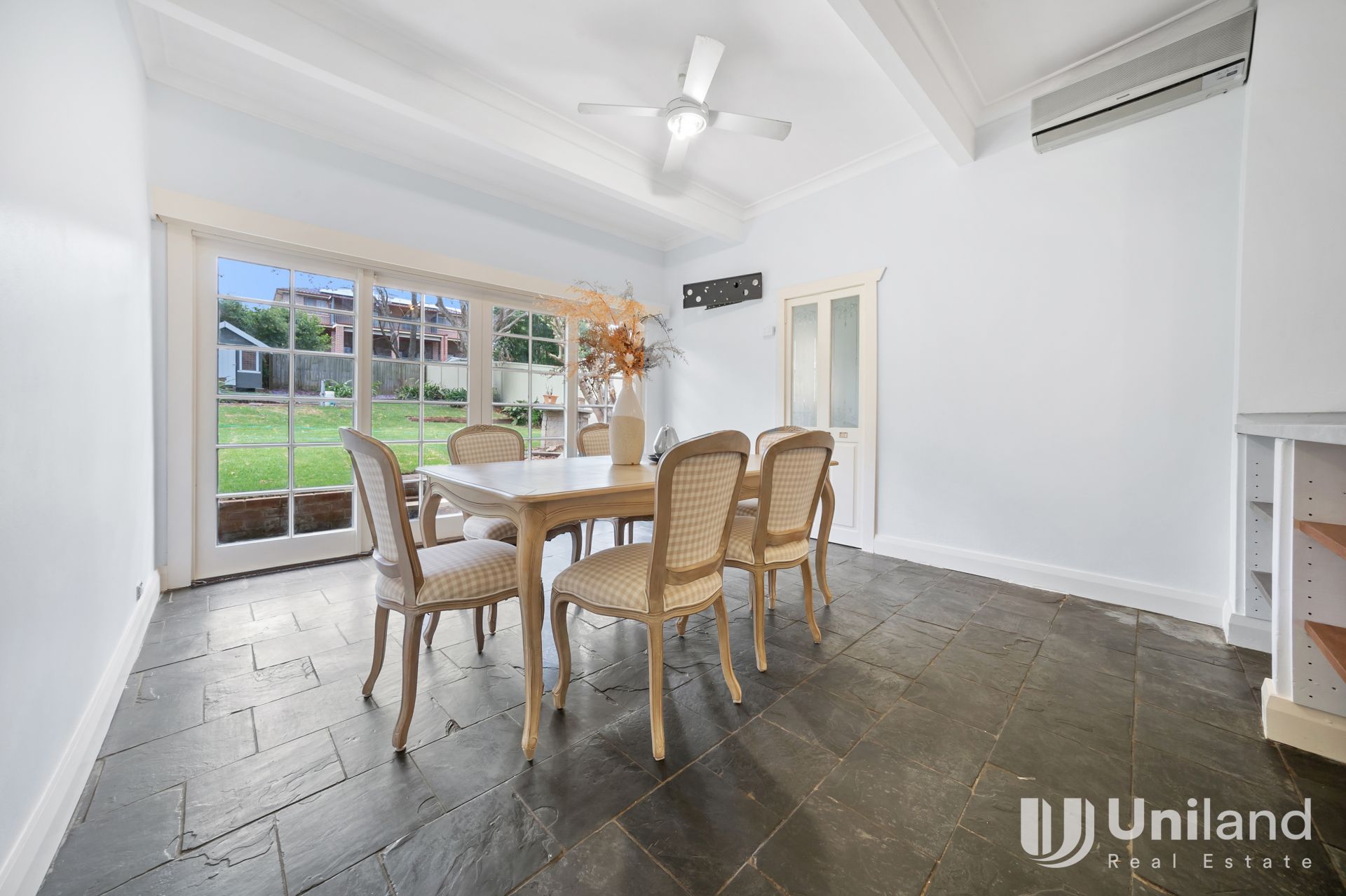 Light-filled dining area with air conditioning, opening to the backyard