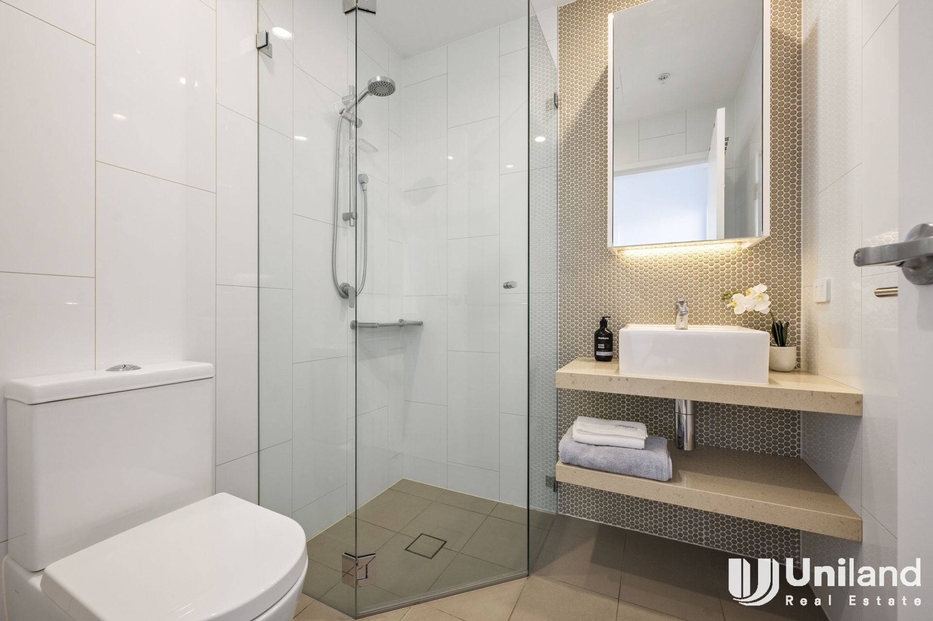 - Modern bathroom with mirrored cabinet & frameless shower screen