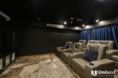 - Home theatre with cinema seating, sound, screen, TV & projector