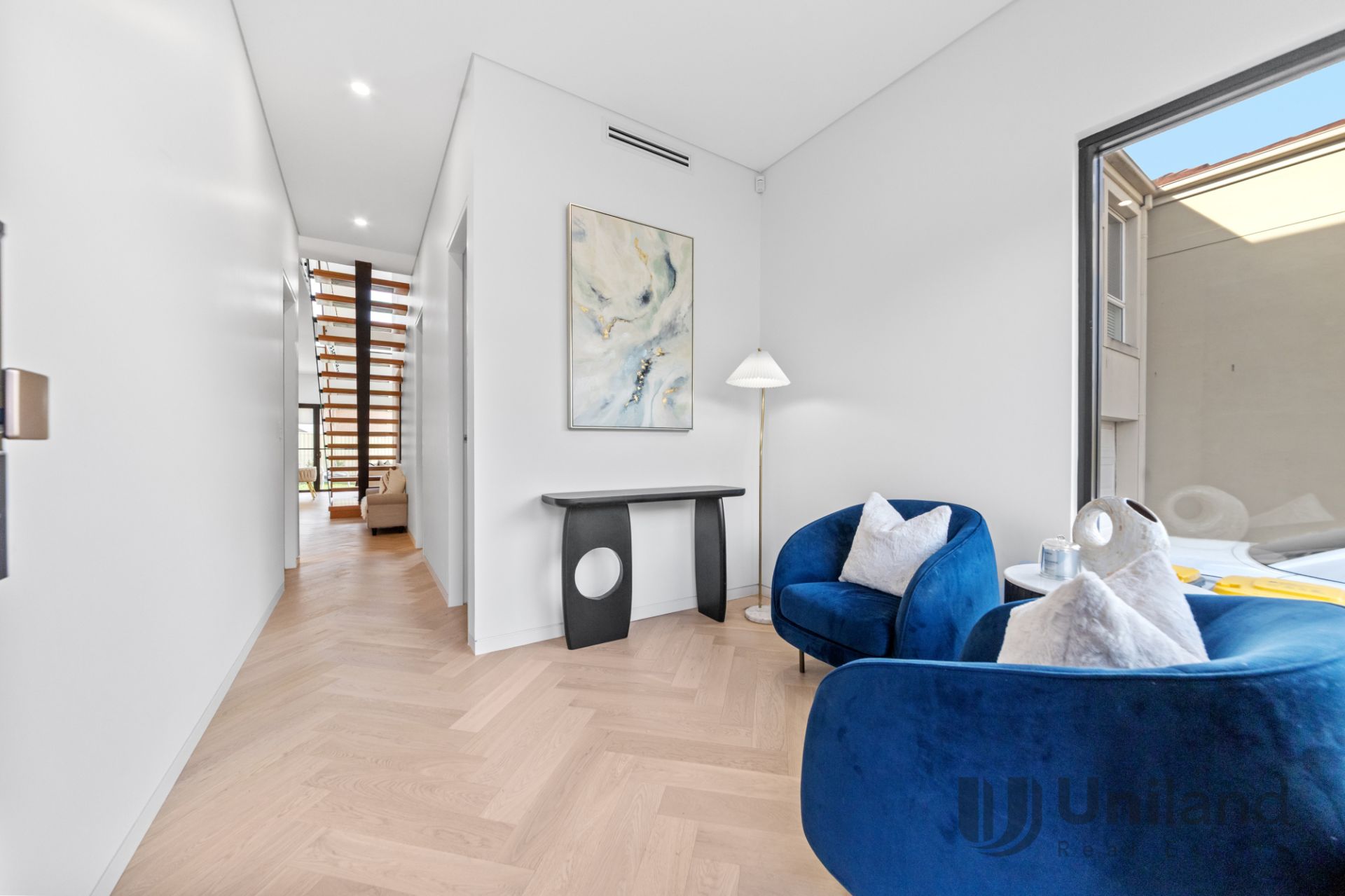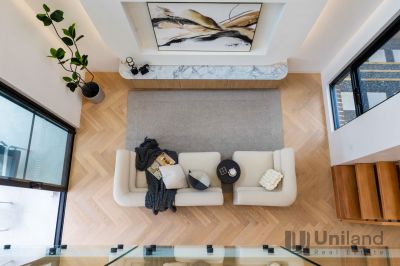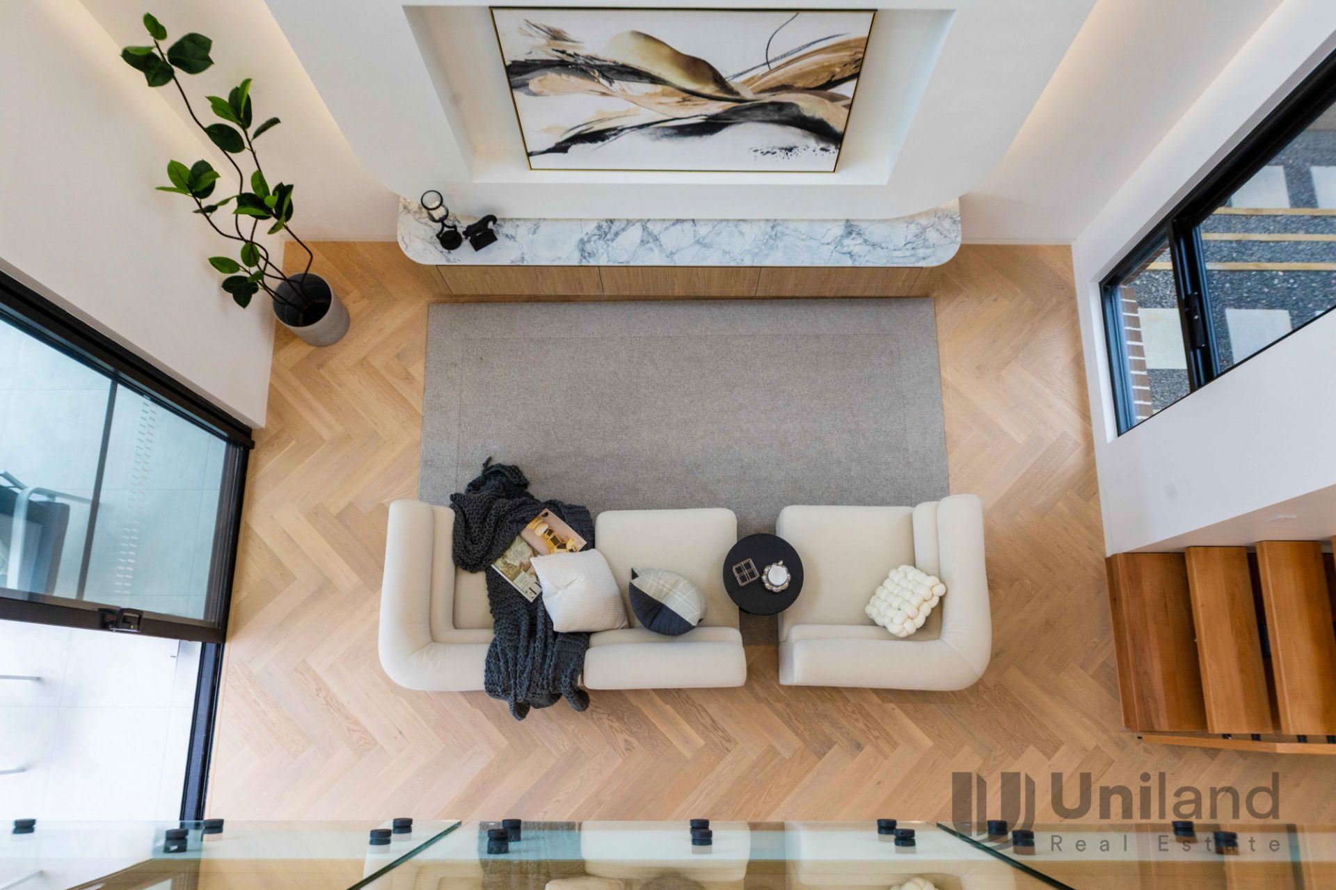 Premium appointments and Herringbone floors lead light-filled interiors to a double-height void framing lounge and dining spaces, complemented by a curved feature wall, ambient lighting, and commercial-grade double glazing.