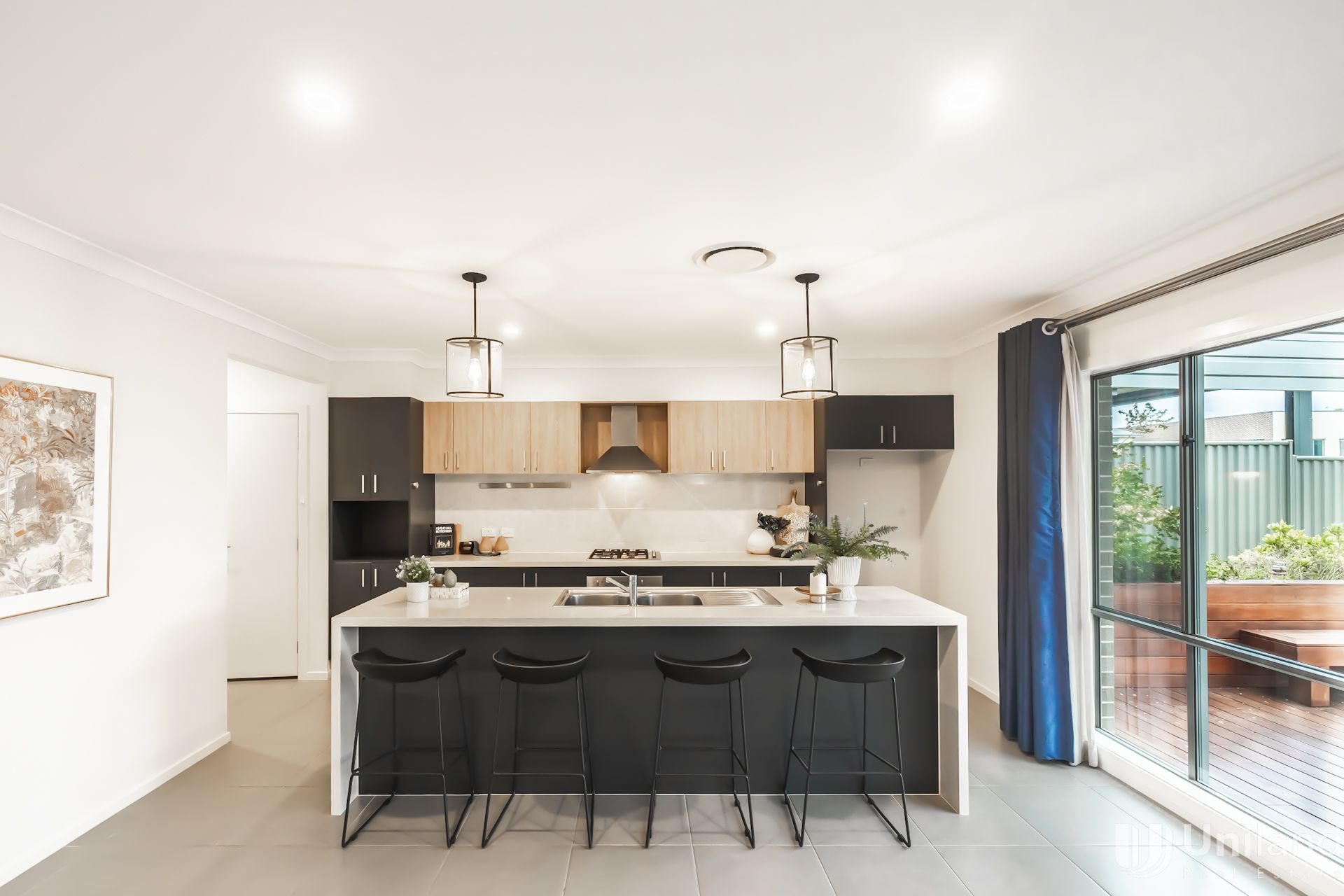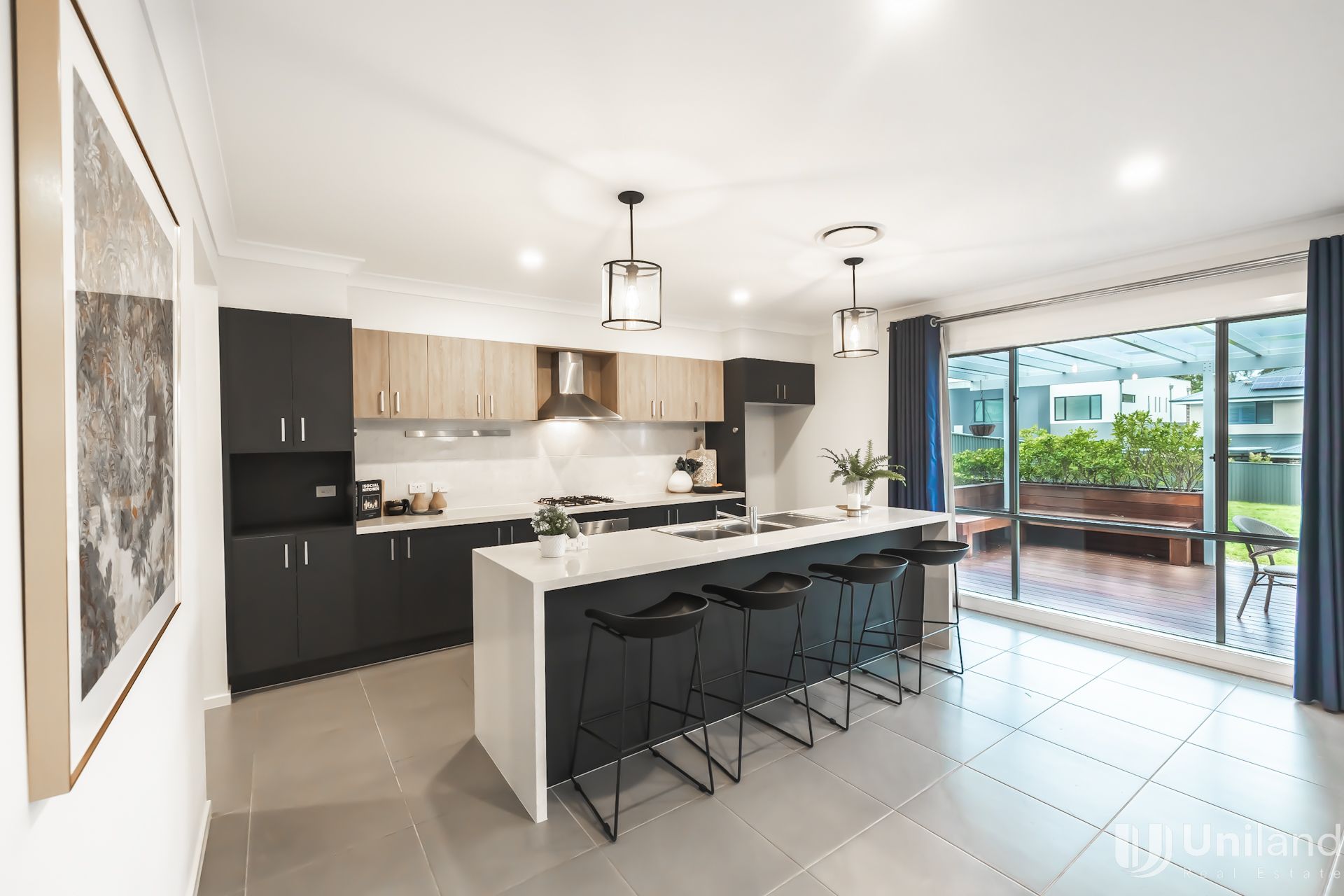 *Open plan gas kitchen with stone bench-top, quality appliances and breakfast bar