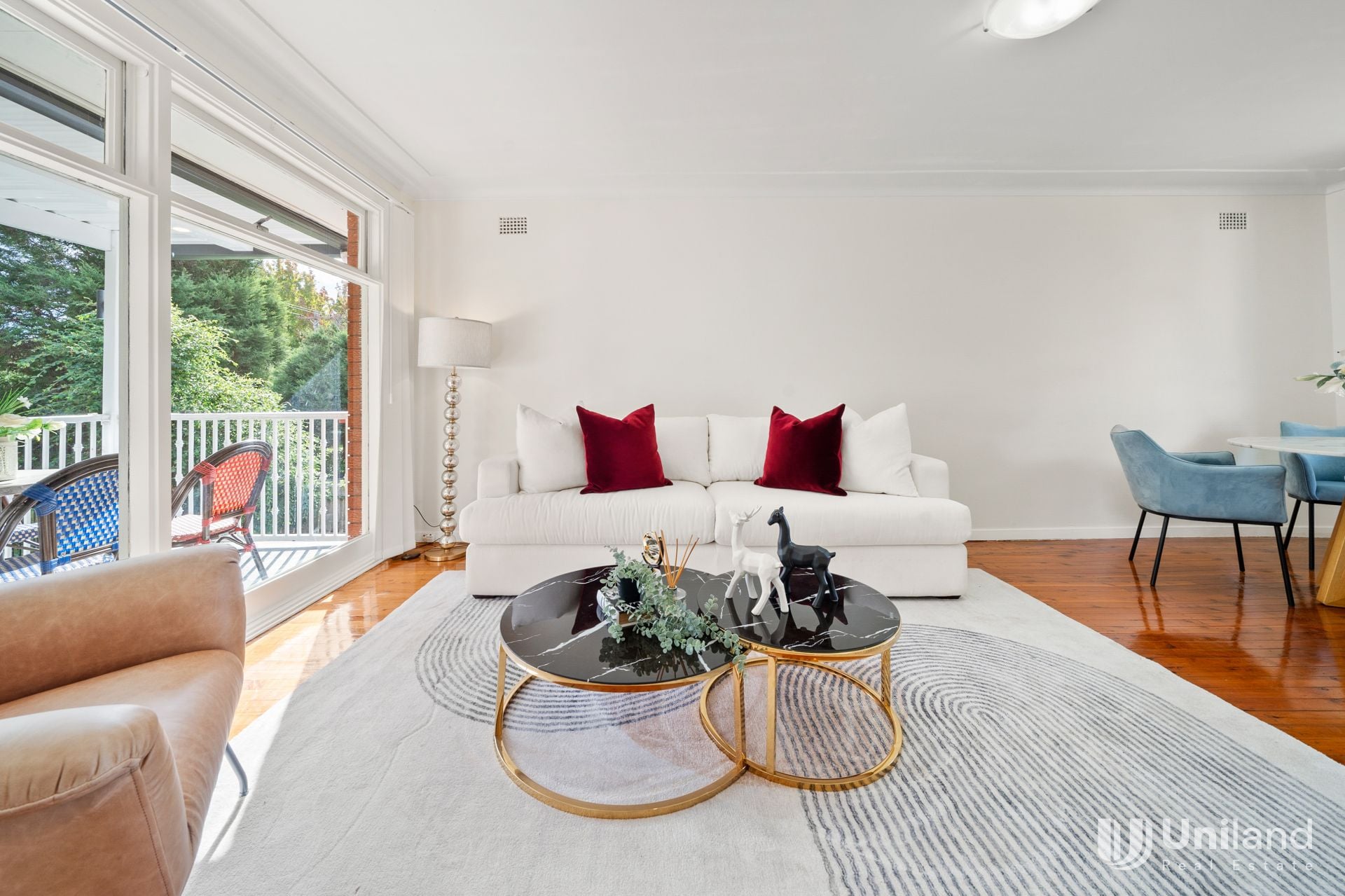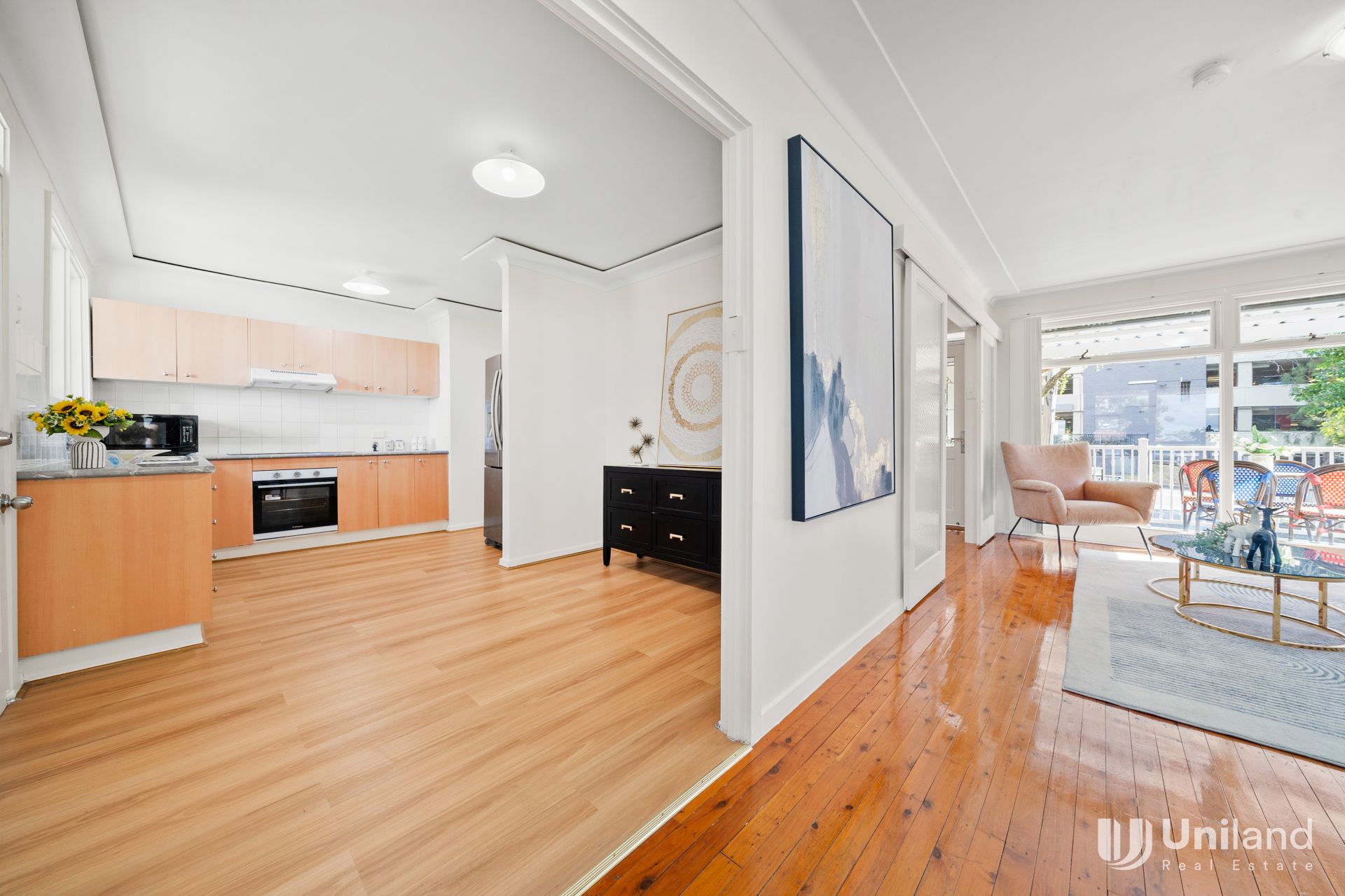 - Fresh interiors evolve through lounge and dining zones to a kitchen reflecting functional design