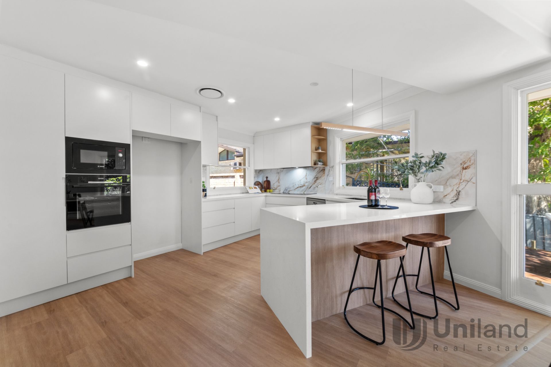 • Custom-designed kitchen features a waterfall-edge sit-at bench, soft-close cabinetry, and new Bosch appliances, including an induction cooktop, built-in microwave, and oven, complemented by a Miele dishwasher and Schweigen rangehood