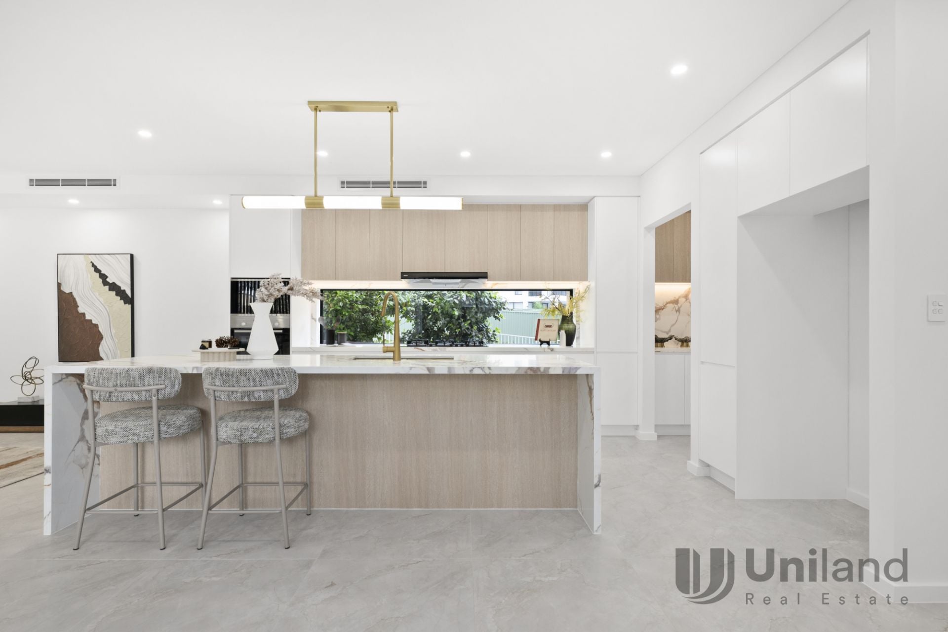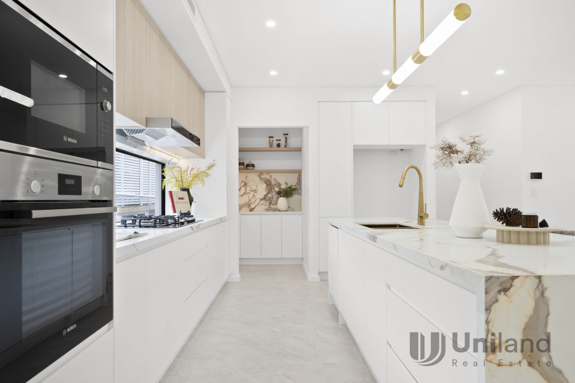 * The stylish kitchen enjoys stone benchtops including to the impressive long waterfall island bench with breakfast bar. It also features high end appliances, gas cooking, stone splashbacks and a lovely butler's pantry