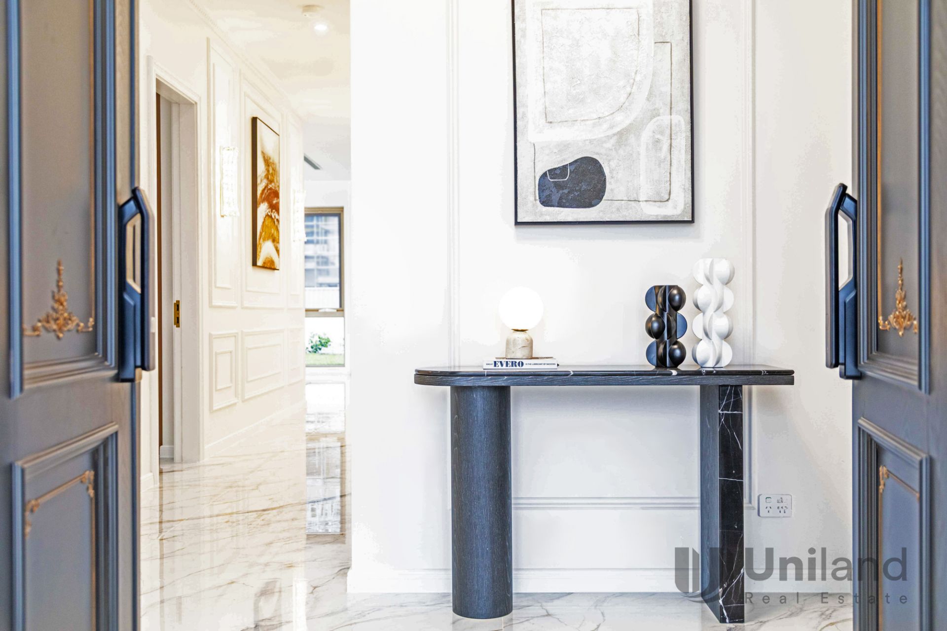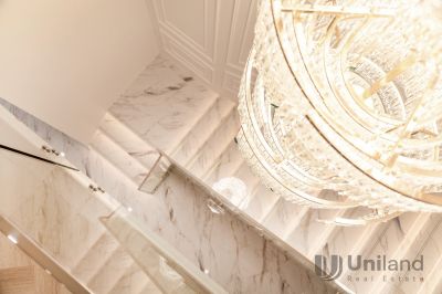 • Interiors display towering ceiling and door heights, elegant wainscoting wall panels, unified marble-effect finishes throughout, dramatic chandeliers, ornate plasterwork, ceiling roses, and gold-tone finishes