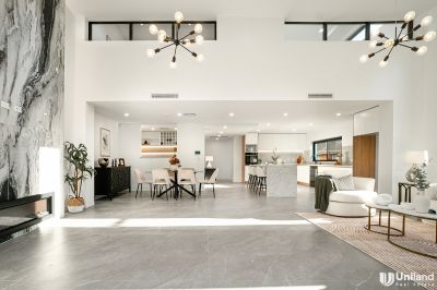 - Open-plan living and dining with a wine bar, double-height void streams with north-facing light, contemporary designer lighting, breathtaking feature wall with fireplace and imported tiles