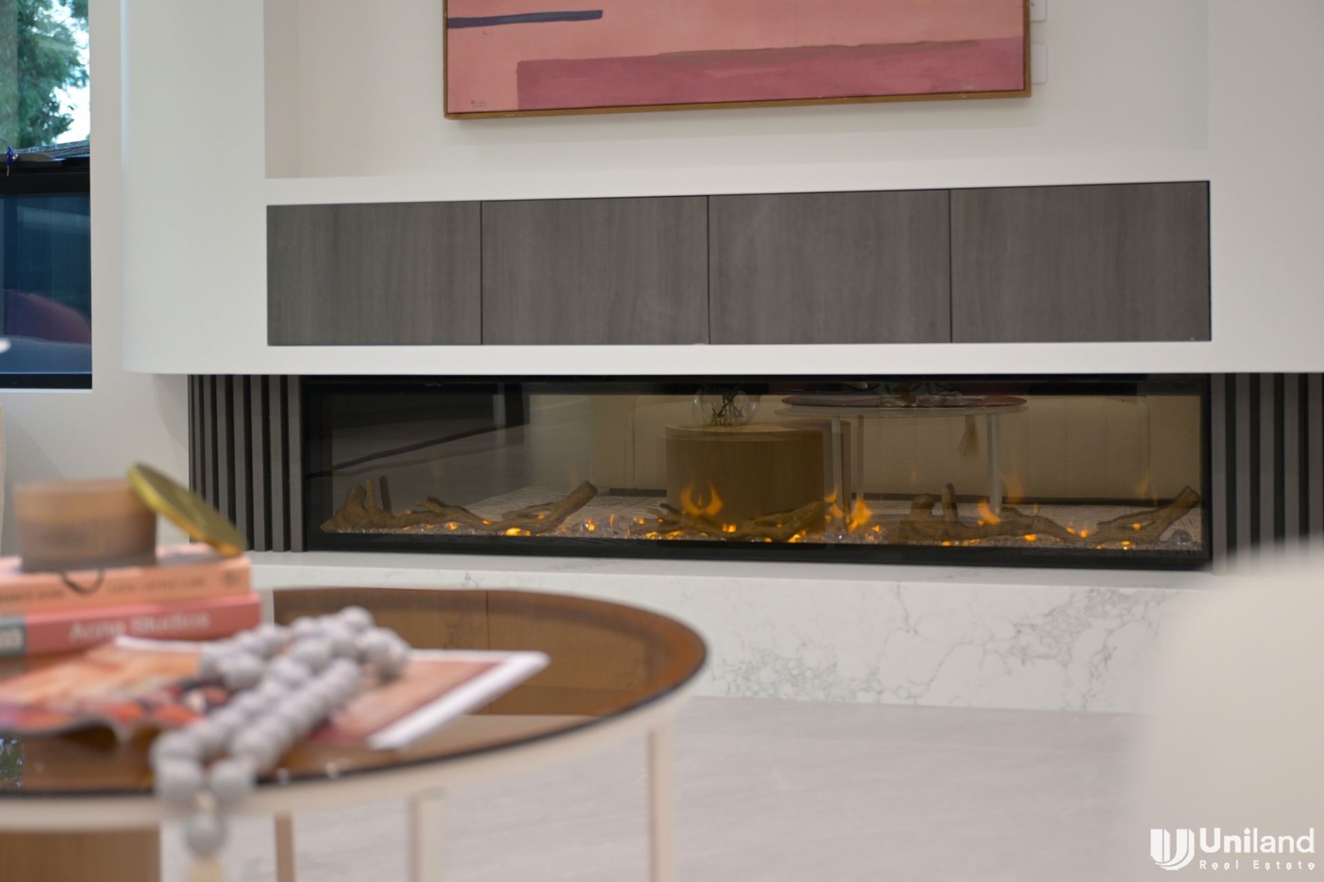 Another highlight is the guest 5th bedroom with ensuite on the entry level and throughout details like the sleek track lighting and feature fireplace all nod to the minimalist designer aesthetic