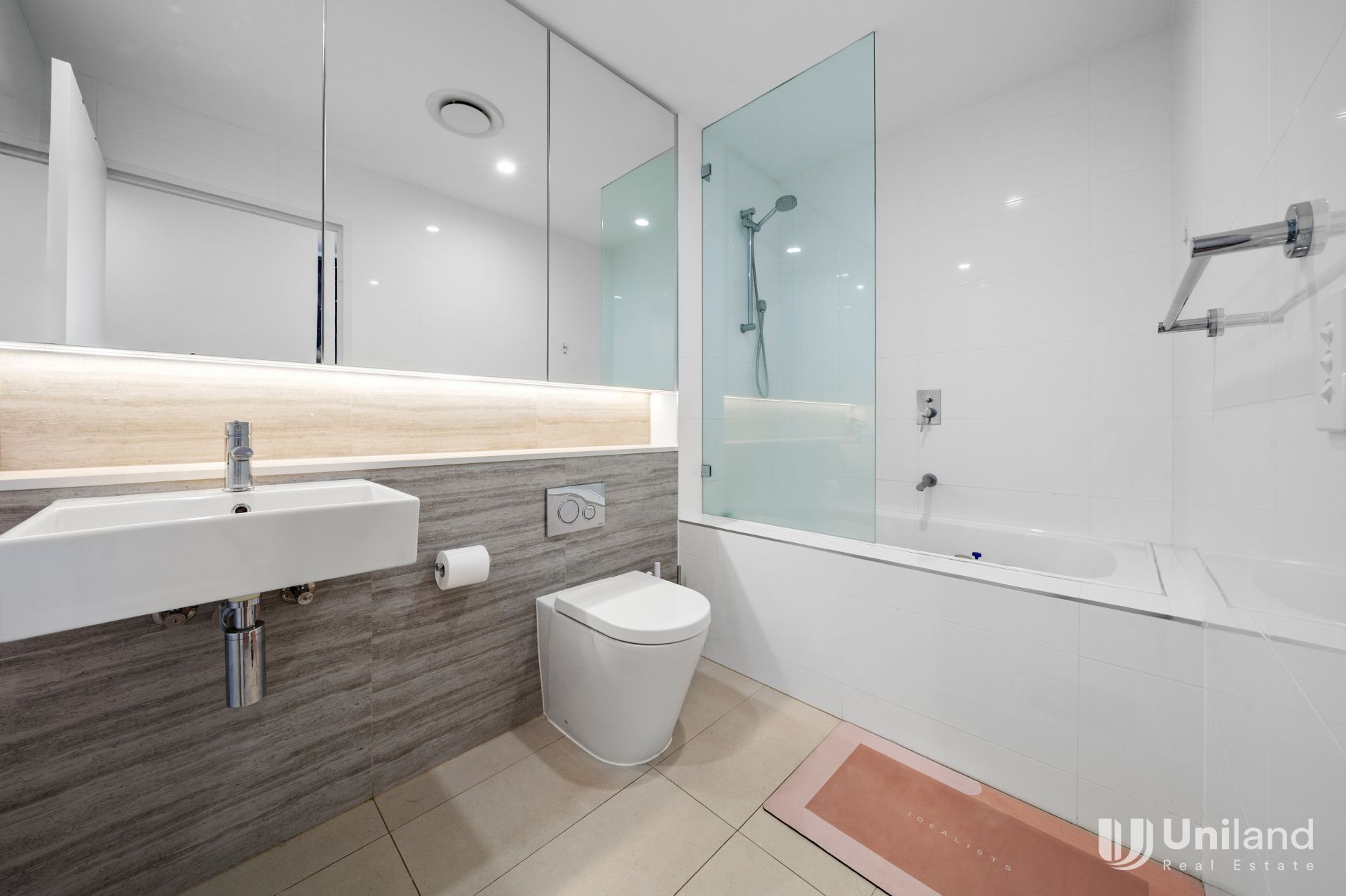 - Modern bathroom with mirrored cabinet & shower bath