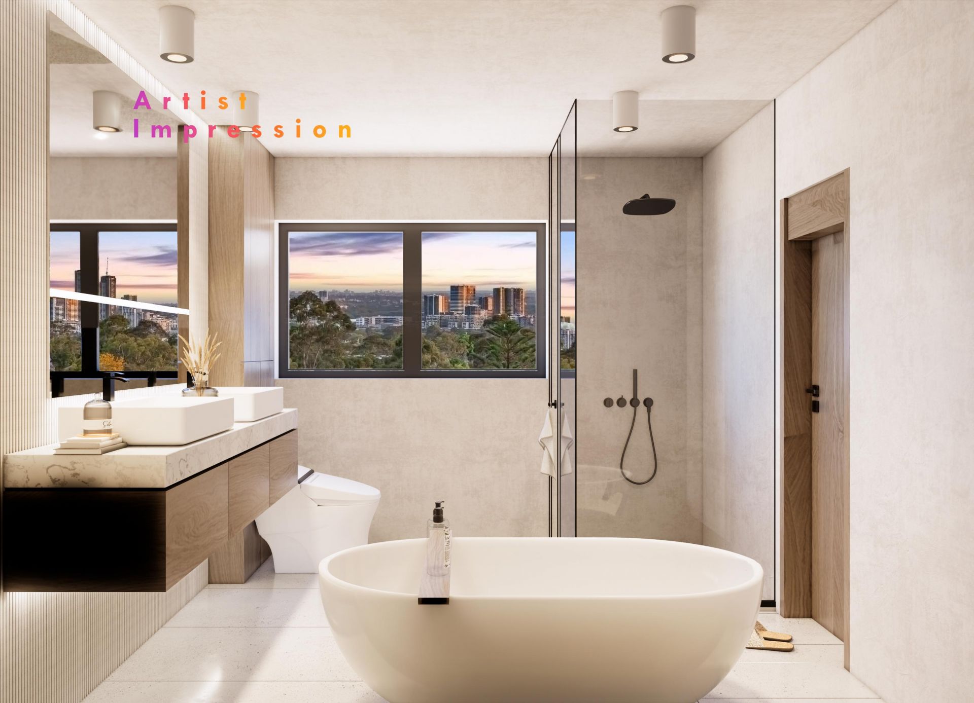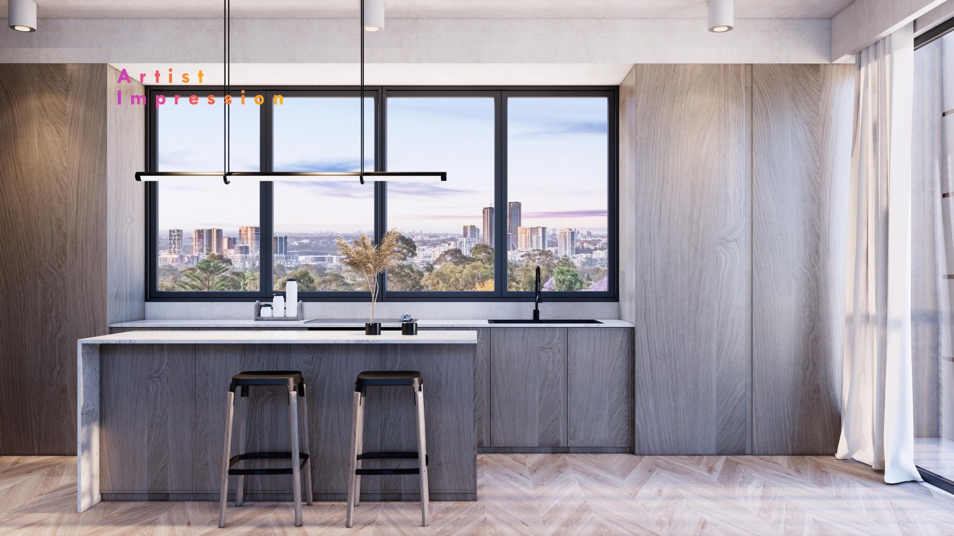 The sprawling block frames an expansive vista stretching from the sparkling city skyline across to Olympic Park and beyond.