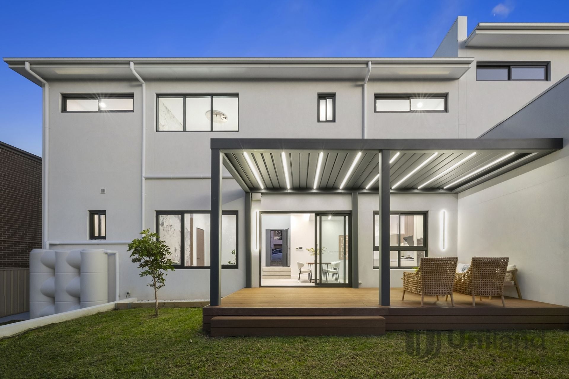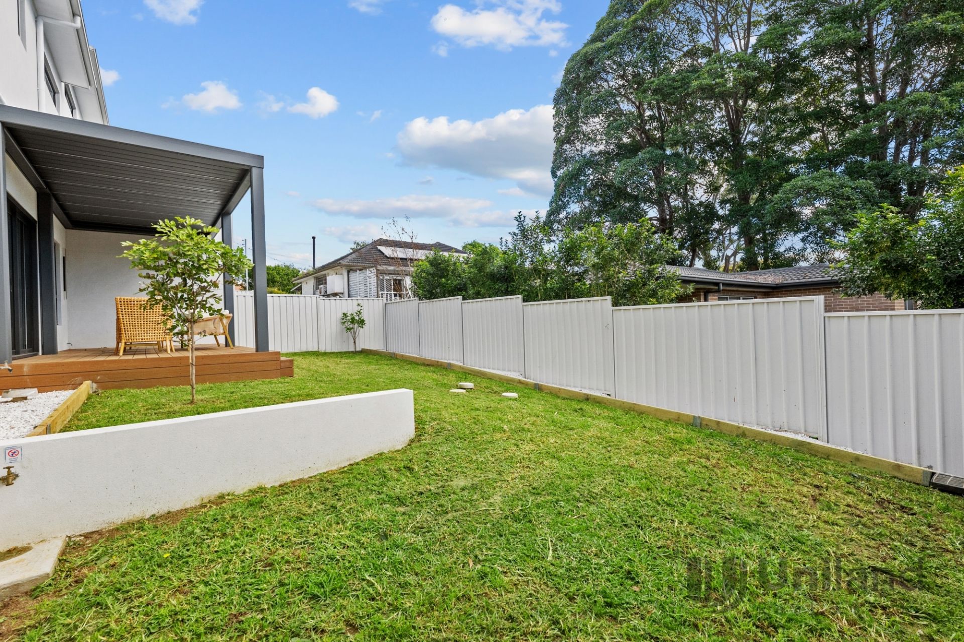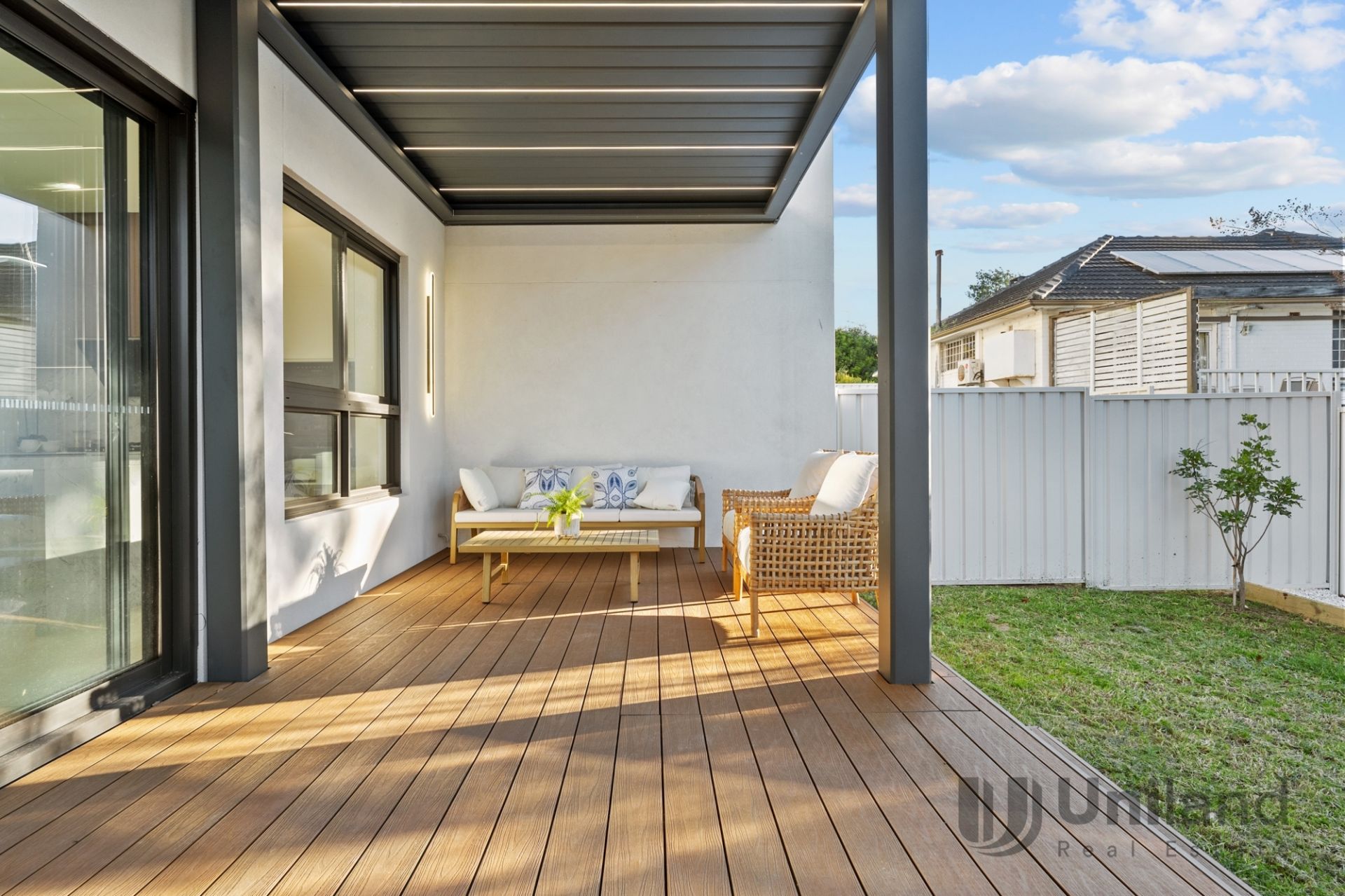 • Stacking sliders transition to covered alfresco entertaining overlooking a flat, child-friendly backyard