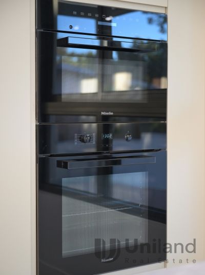 • Stunning stone island highlighted by a sculptured pendant light, high-end appliances include a Miele steam oven, wall oven, gas cooktop, and powerful rangehood