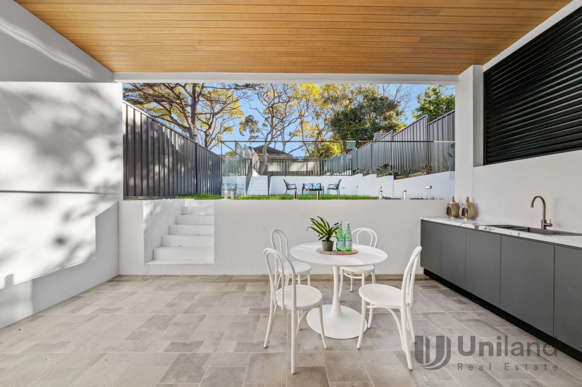 * Covered alfresco entertaining joins an outdoor kitchen screened for privacy, with a grassed tiered yard complete with lighting