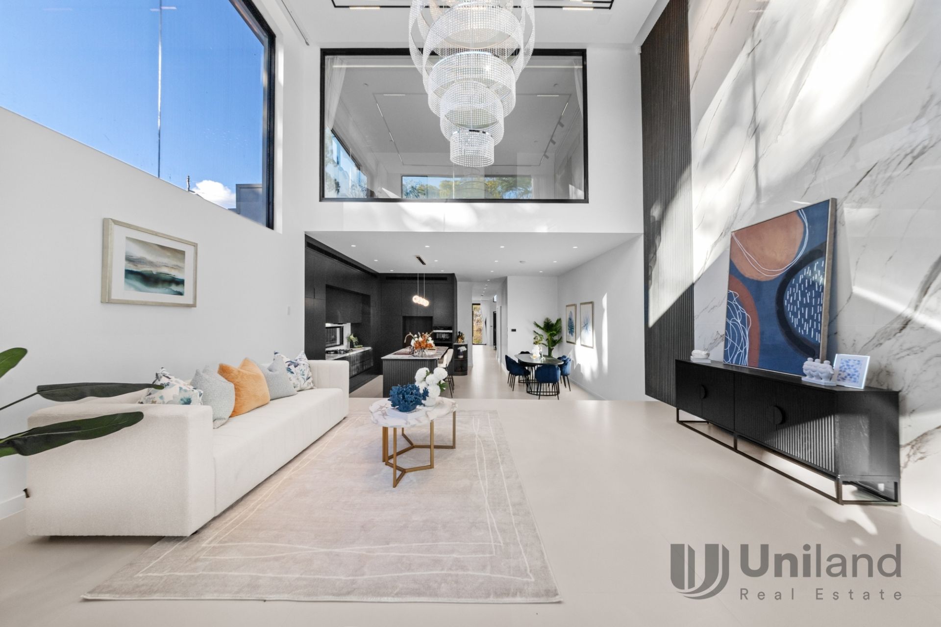* Distinct yet connected living zones include a sitting room with a modern wine bar, open plan living and dining set beneath a striking double-storey glazed void, enhancing scale and light