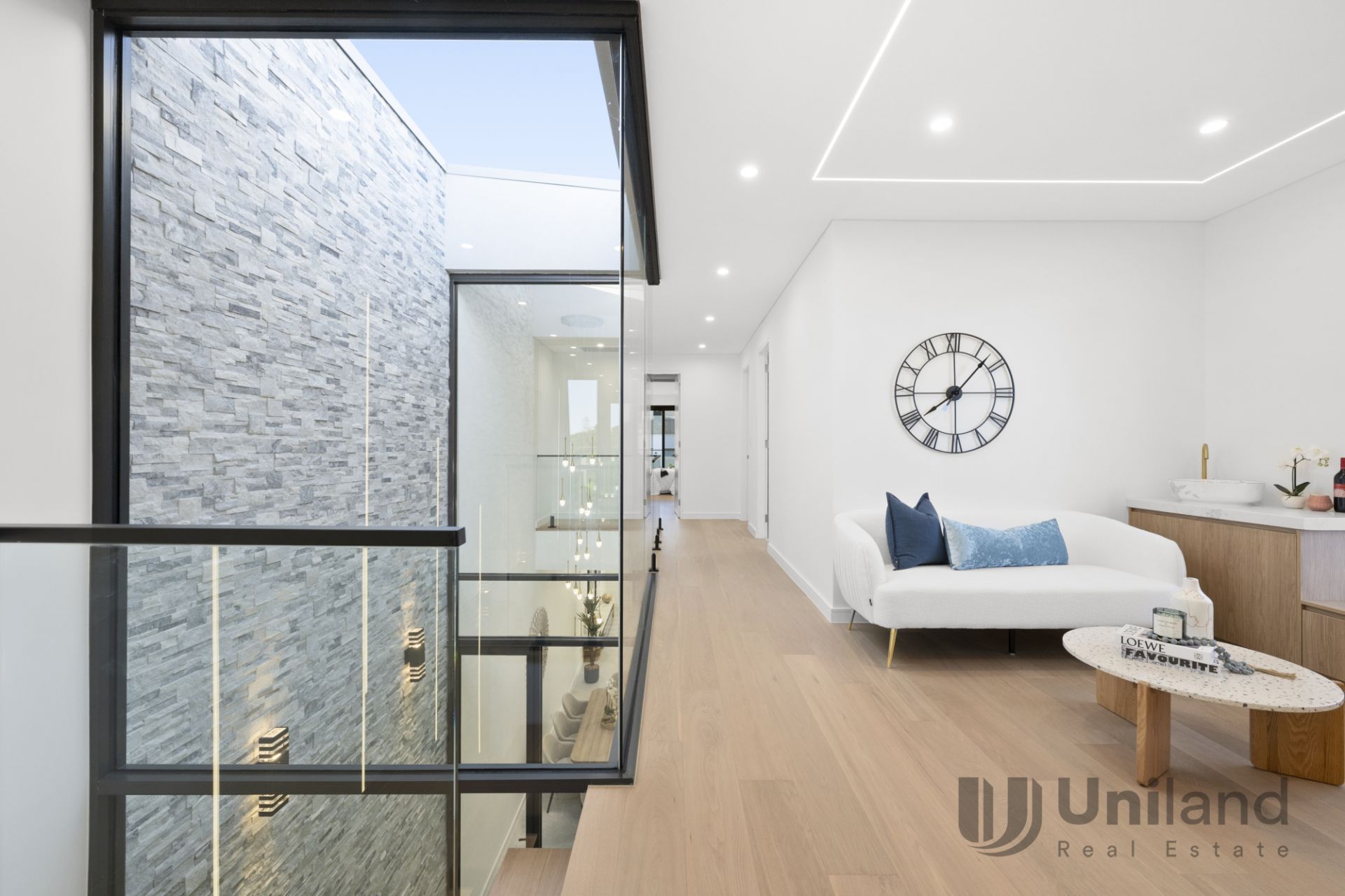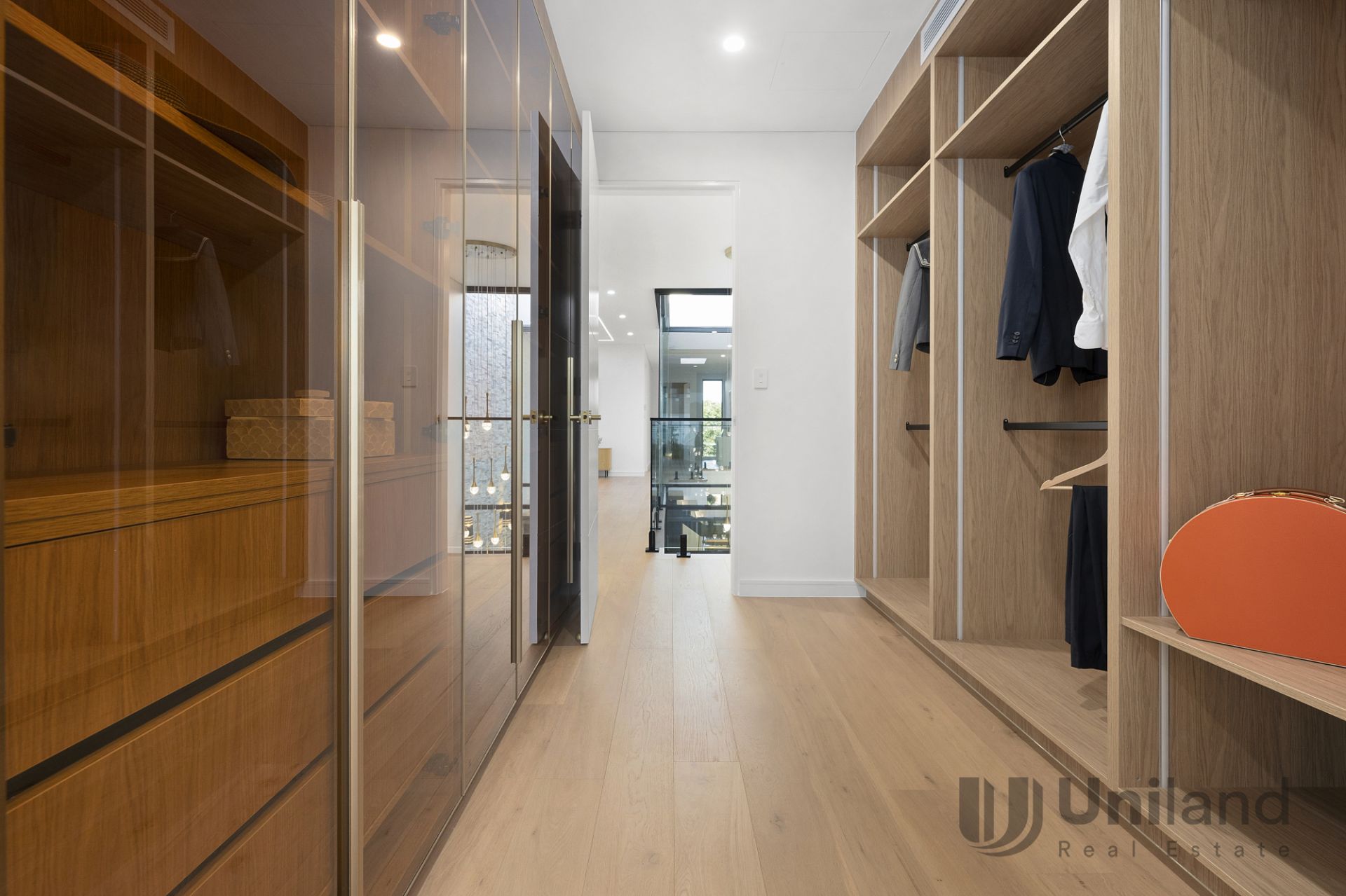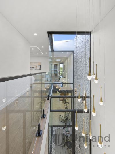Open plan entertaining and dining zones unfold around a showpiece kitchen joined by a generous butler's pantry and bespoke island. Floating stairs ascend to a second level of living, enjoying overhead views of the courtyard and perfected by a seamless wet bar and window seat finished with built-in storage.