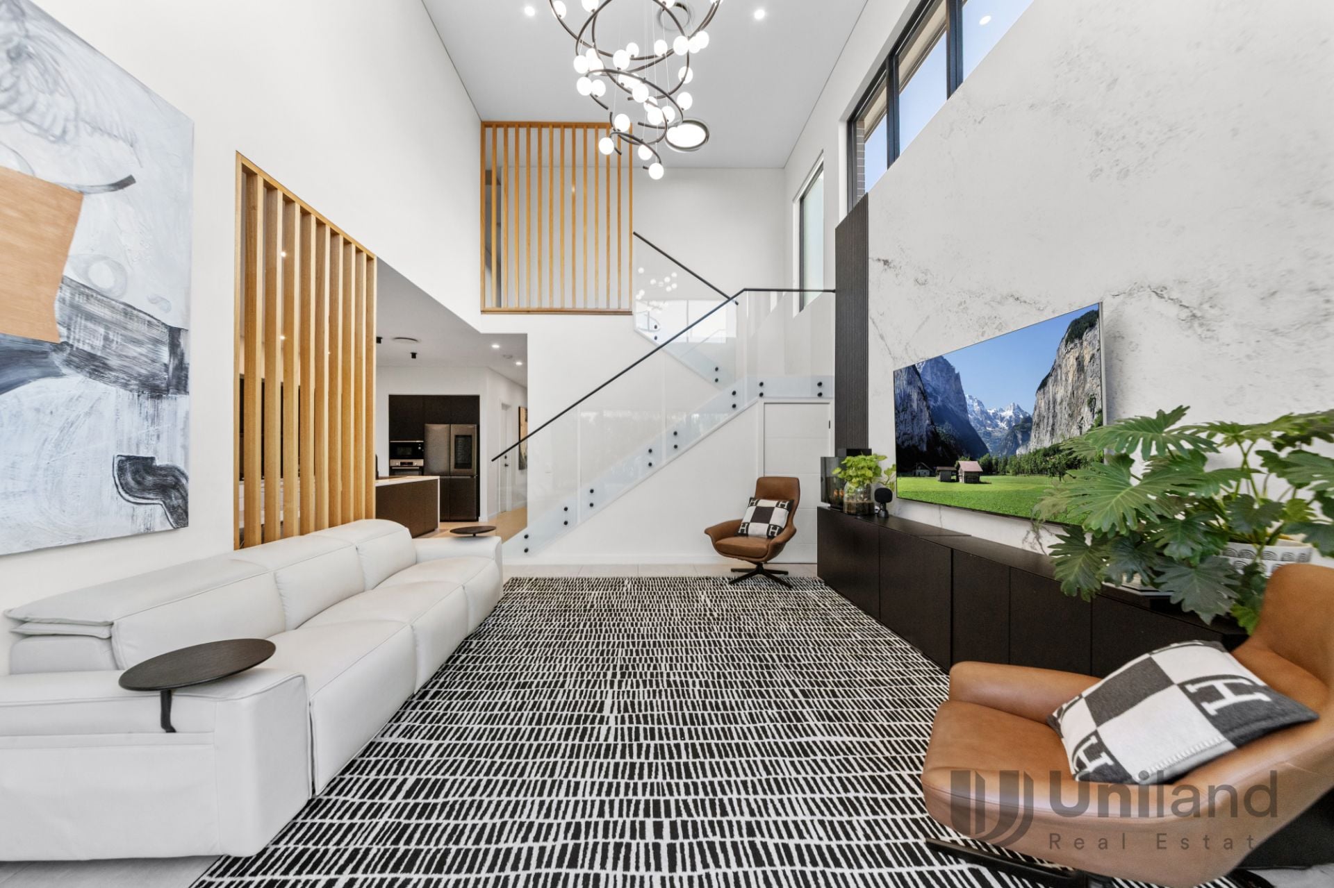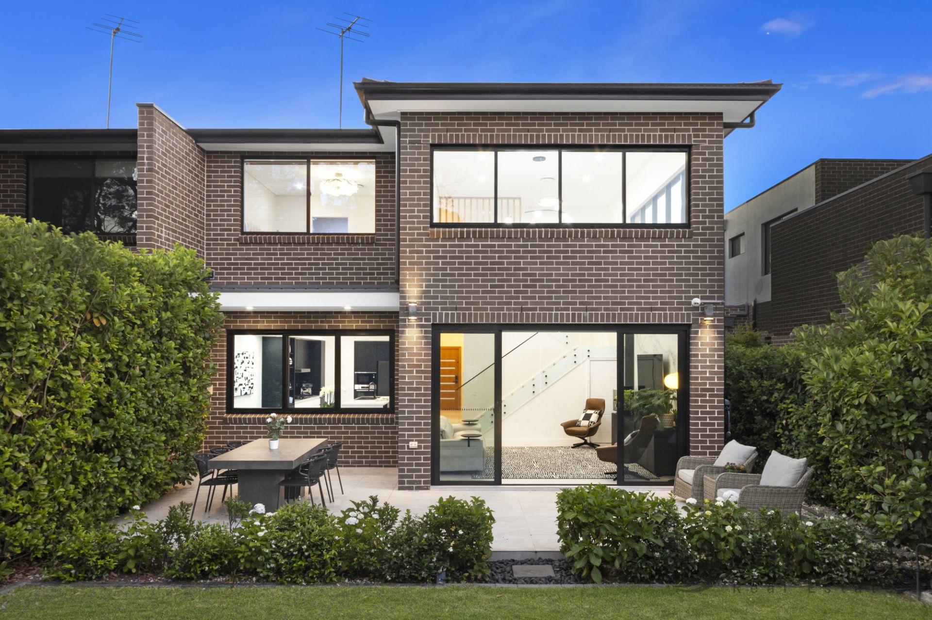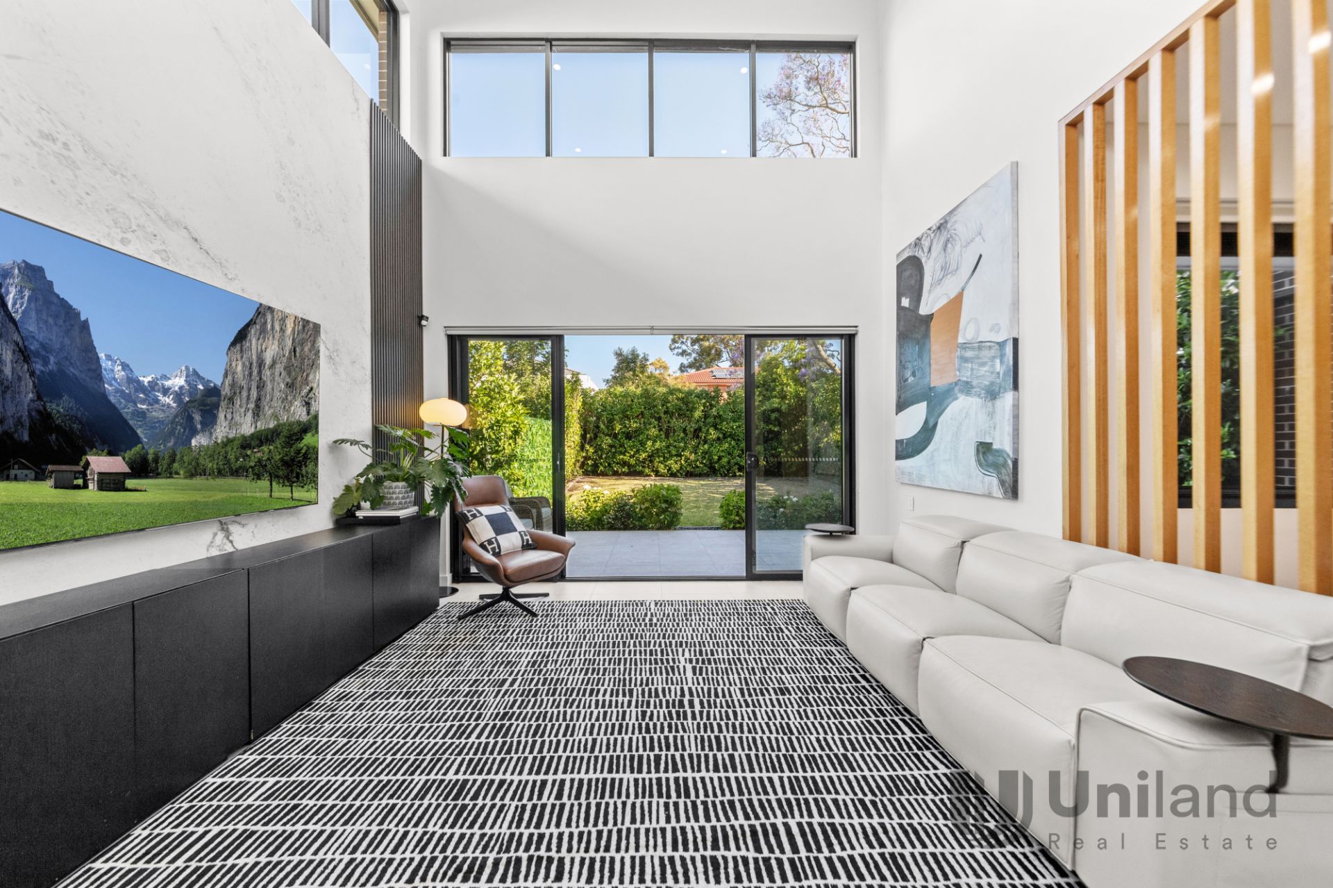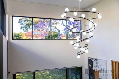 *Soaring double-storey void bordered by high modern windows creates an airy sense of space over living.