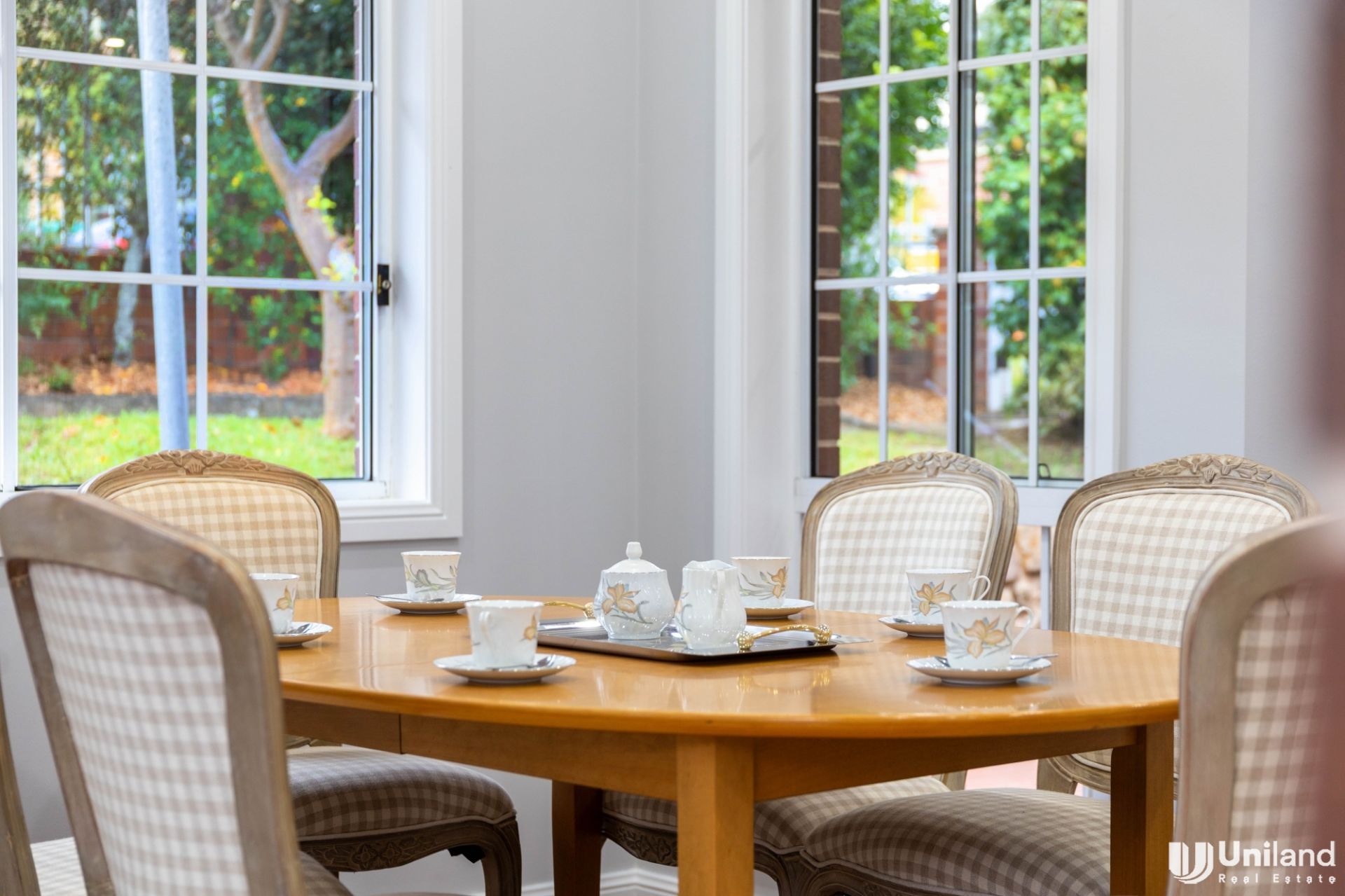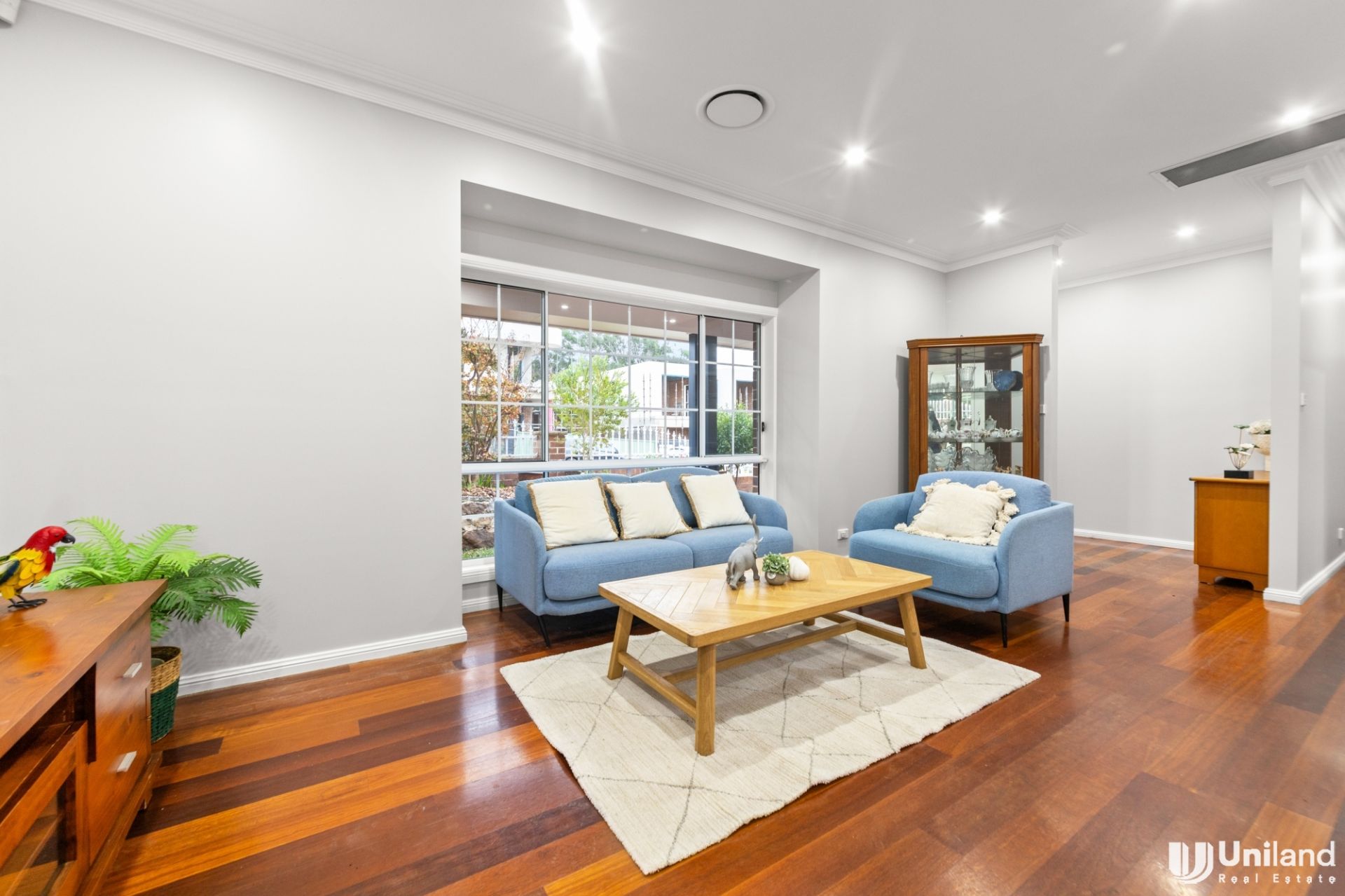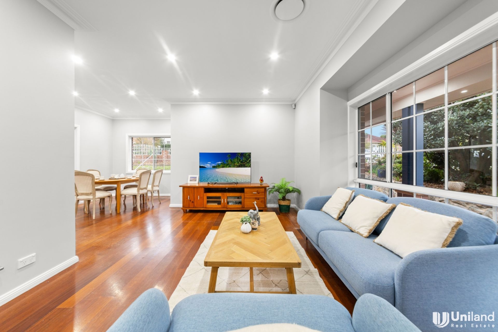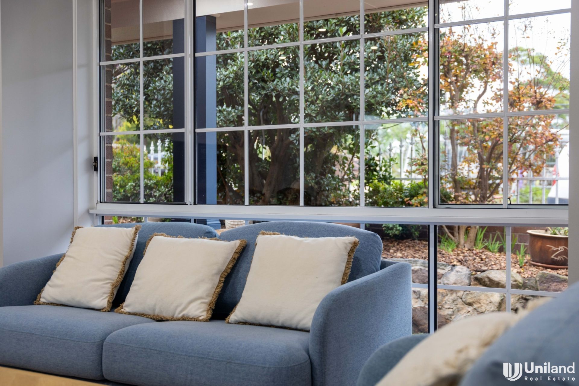 * Elegant lounge room setting gracefully connects with dining, surrounded by private garden outlooks