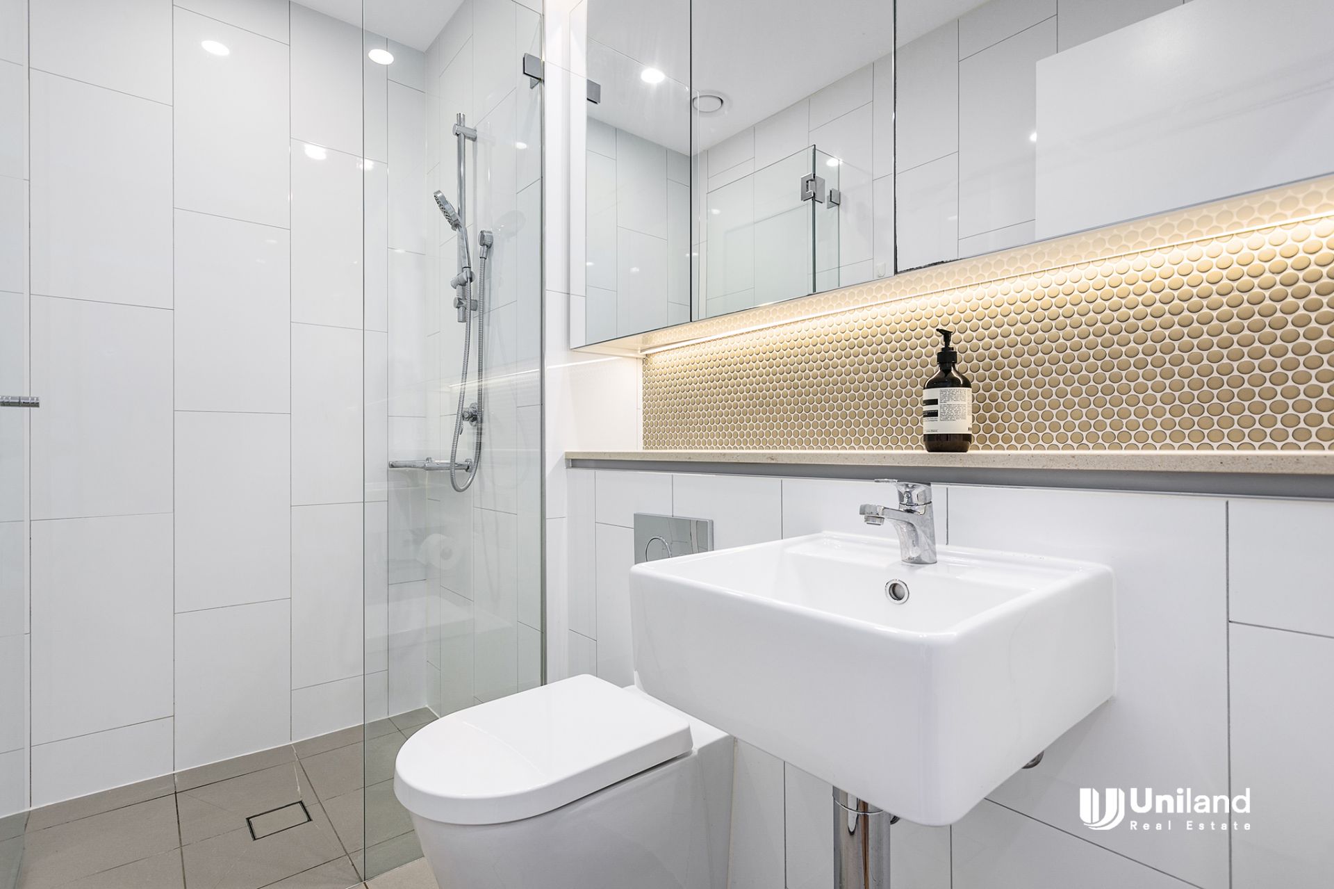 - Modern bathroom with mirrored cabinet & frameless shower screen