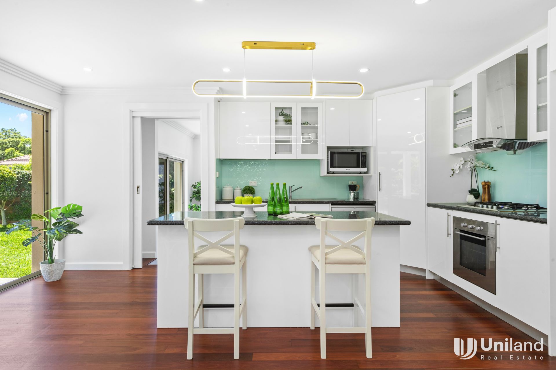 -Gourmet gas kitchen with stone benchtop and quality appliances.