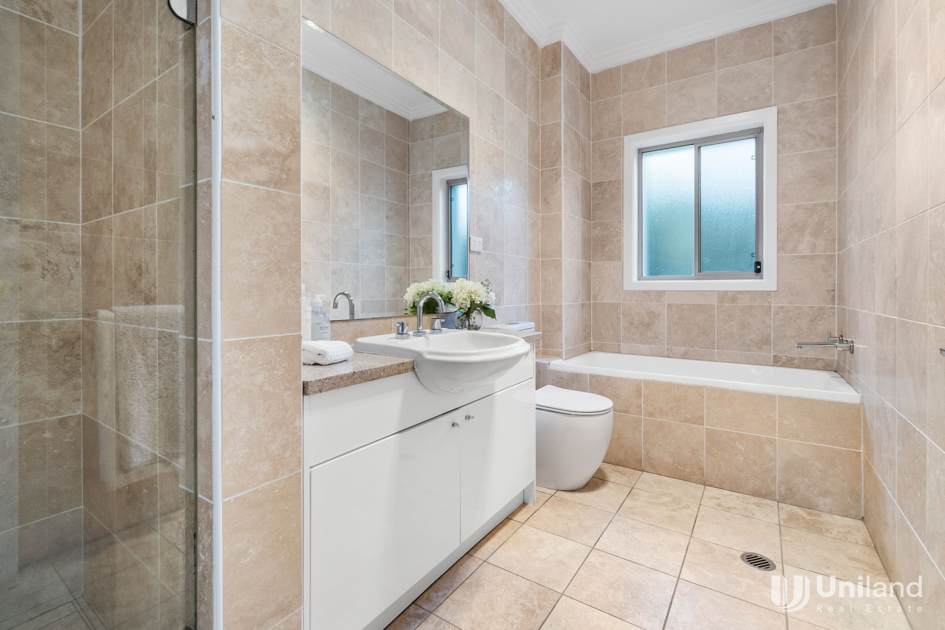 -Modern bathroom with floor-to-ceiling tiles.