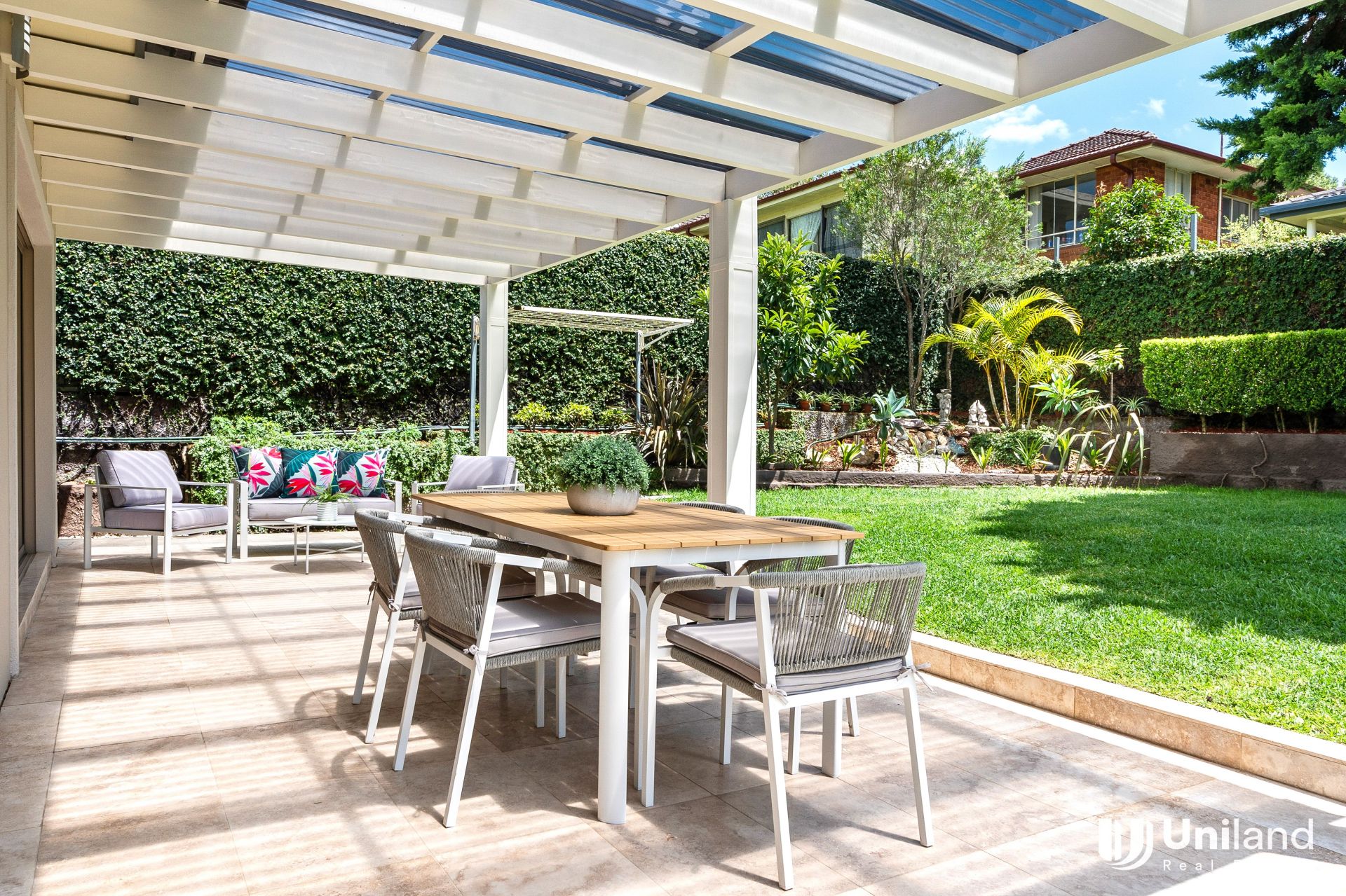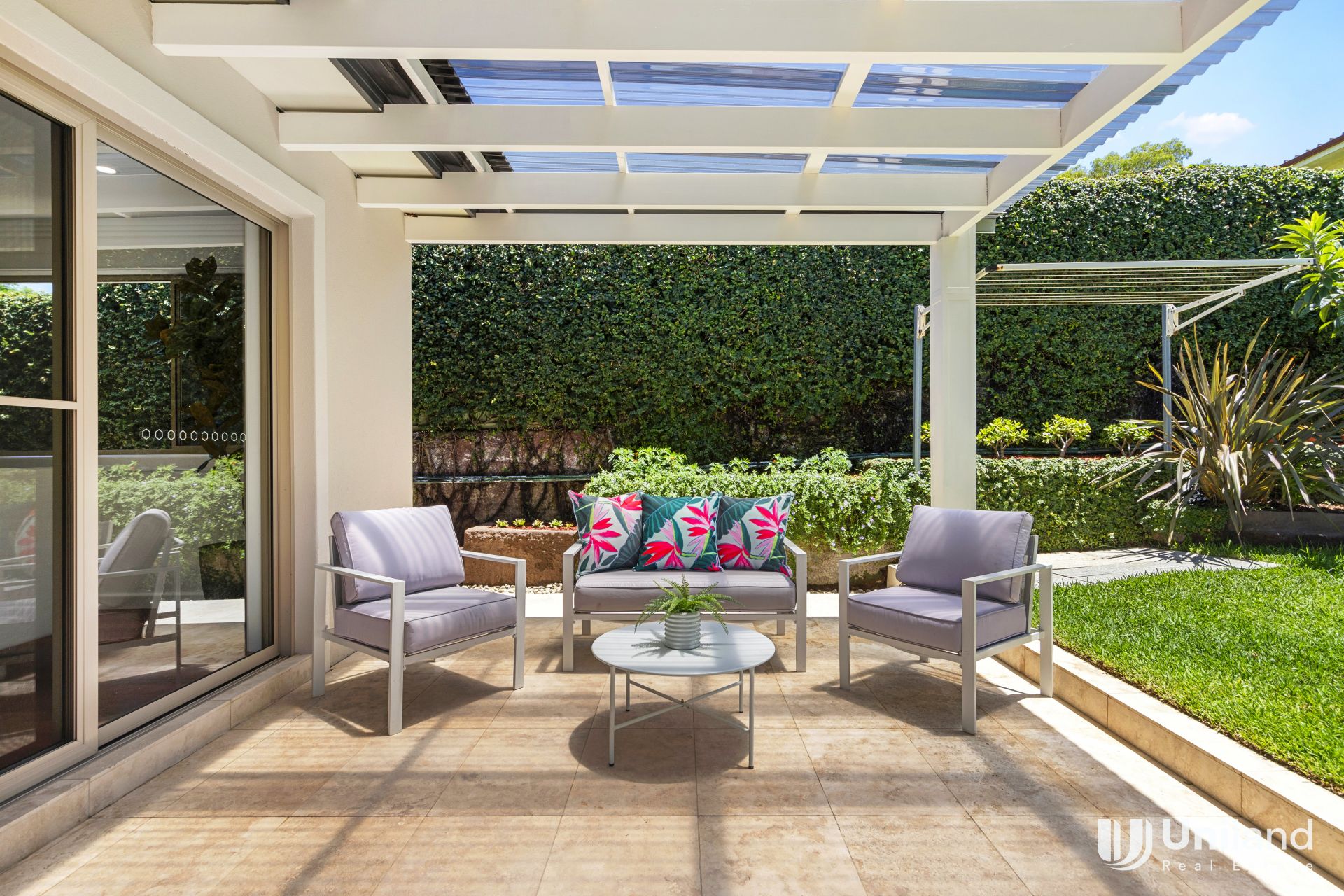 -Large outdoor entertaining area with a covered patio overlooking the secure, paved backyard with Northern Sun-perfect for furry friends and small children.