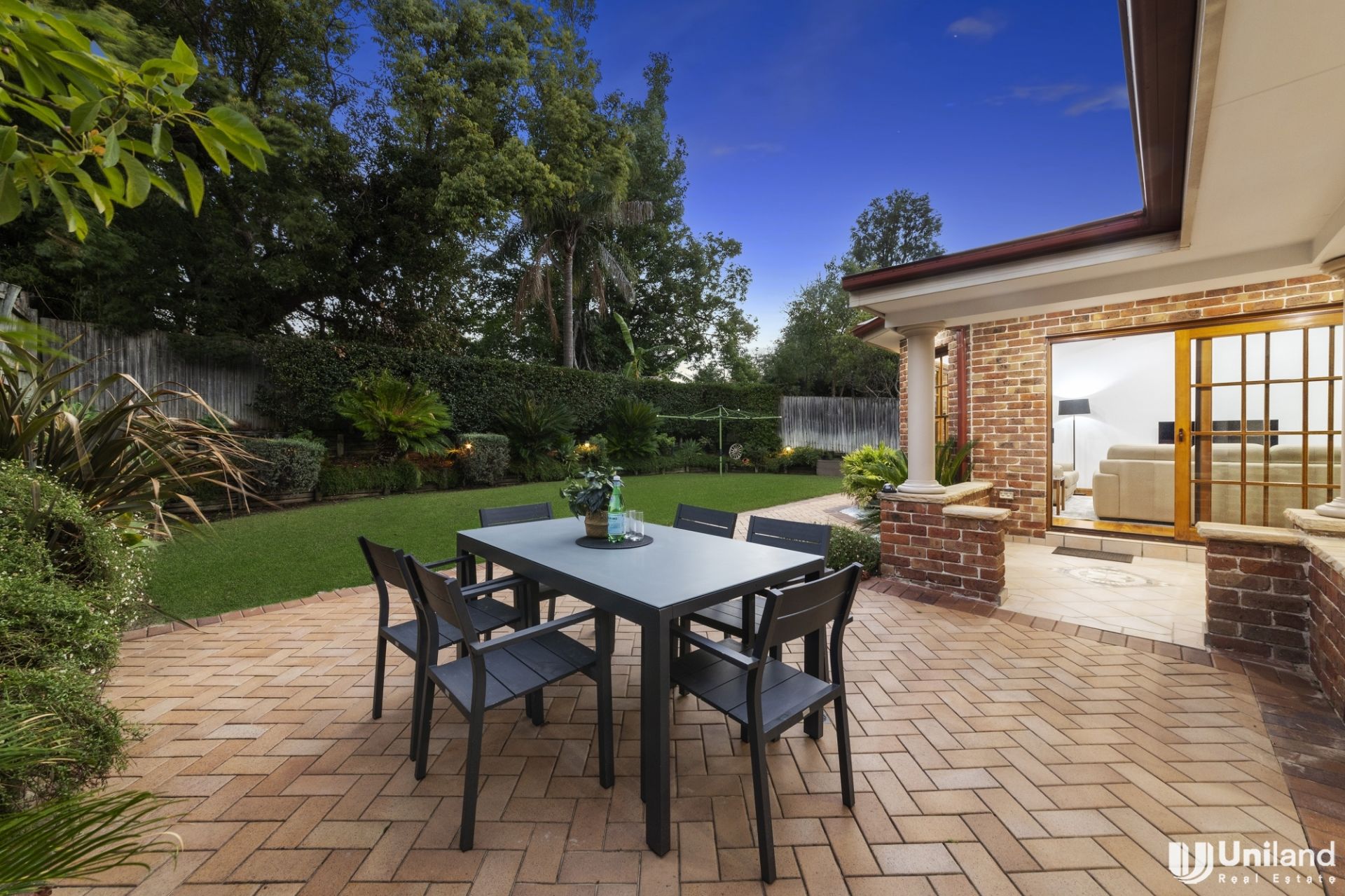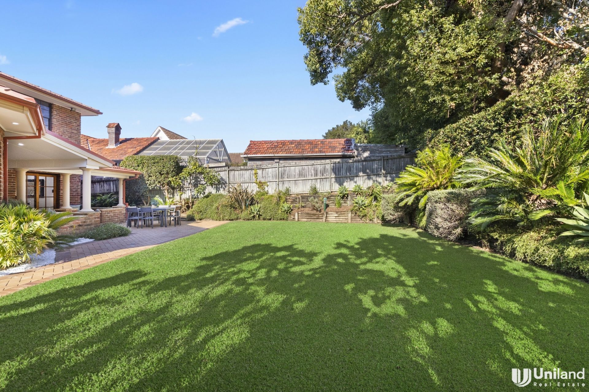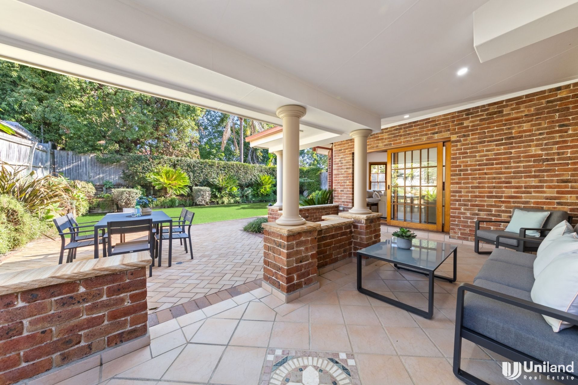 *Large outdoor entertaining area with covered outdoor dining and BBQ zone overlooking the secure, level rear garden—perfect for furry friends and small children