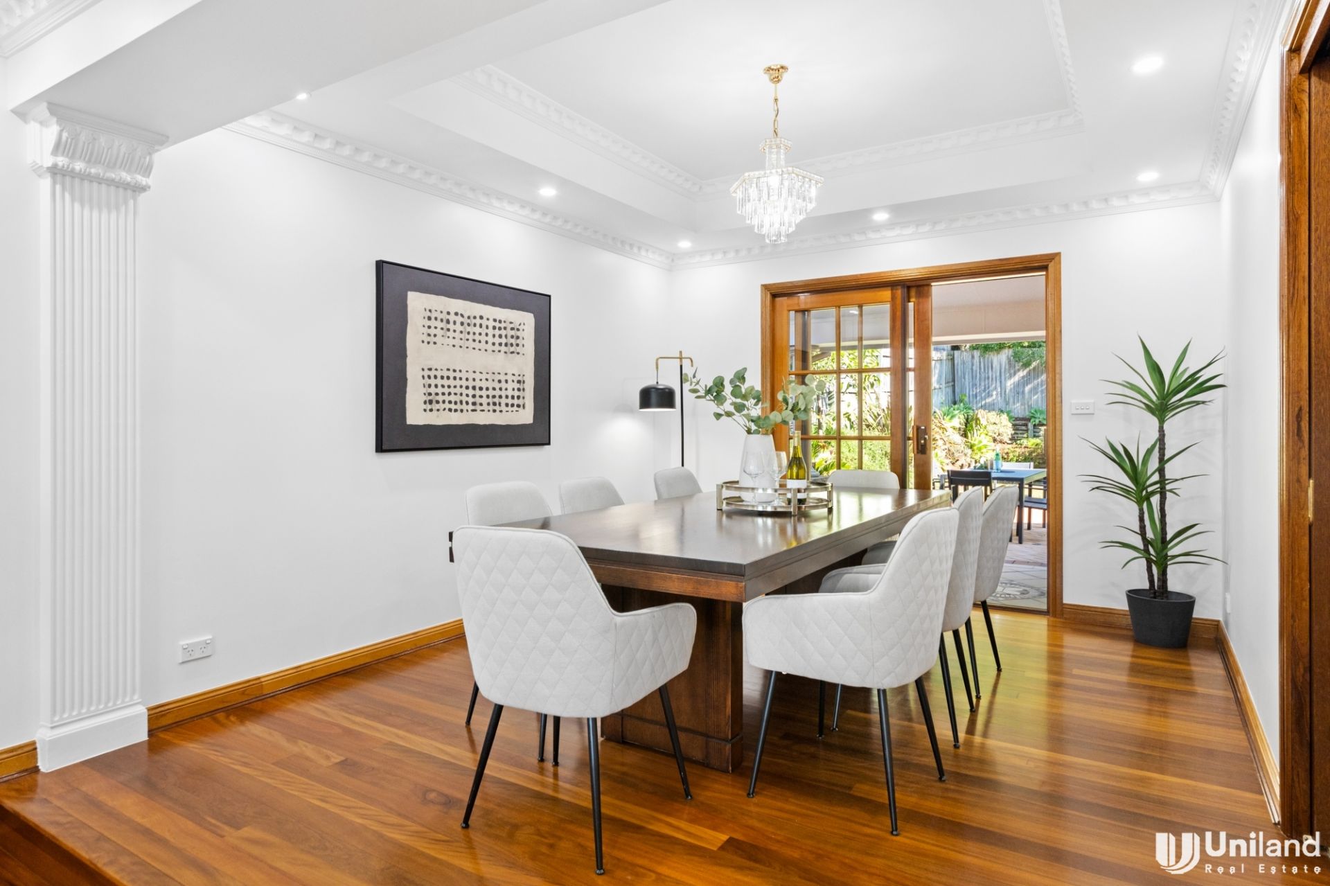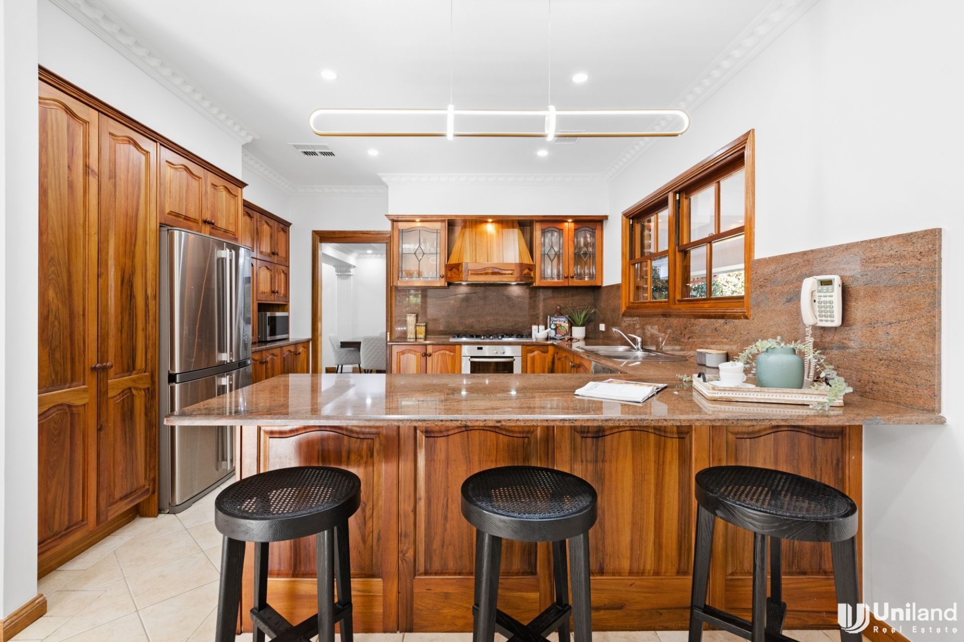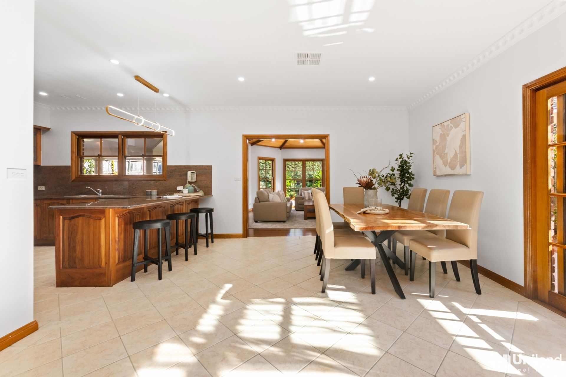 The spacious floor plan offers multiple living zones, and the lawn and gardens are both blissfully sun-kissed and incredibly private. The central granite kitchen is perfectly placed between the casual and formal dining areas, and, there is also the ability to dine alfresco with a covered outdoor entertaining area.