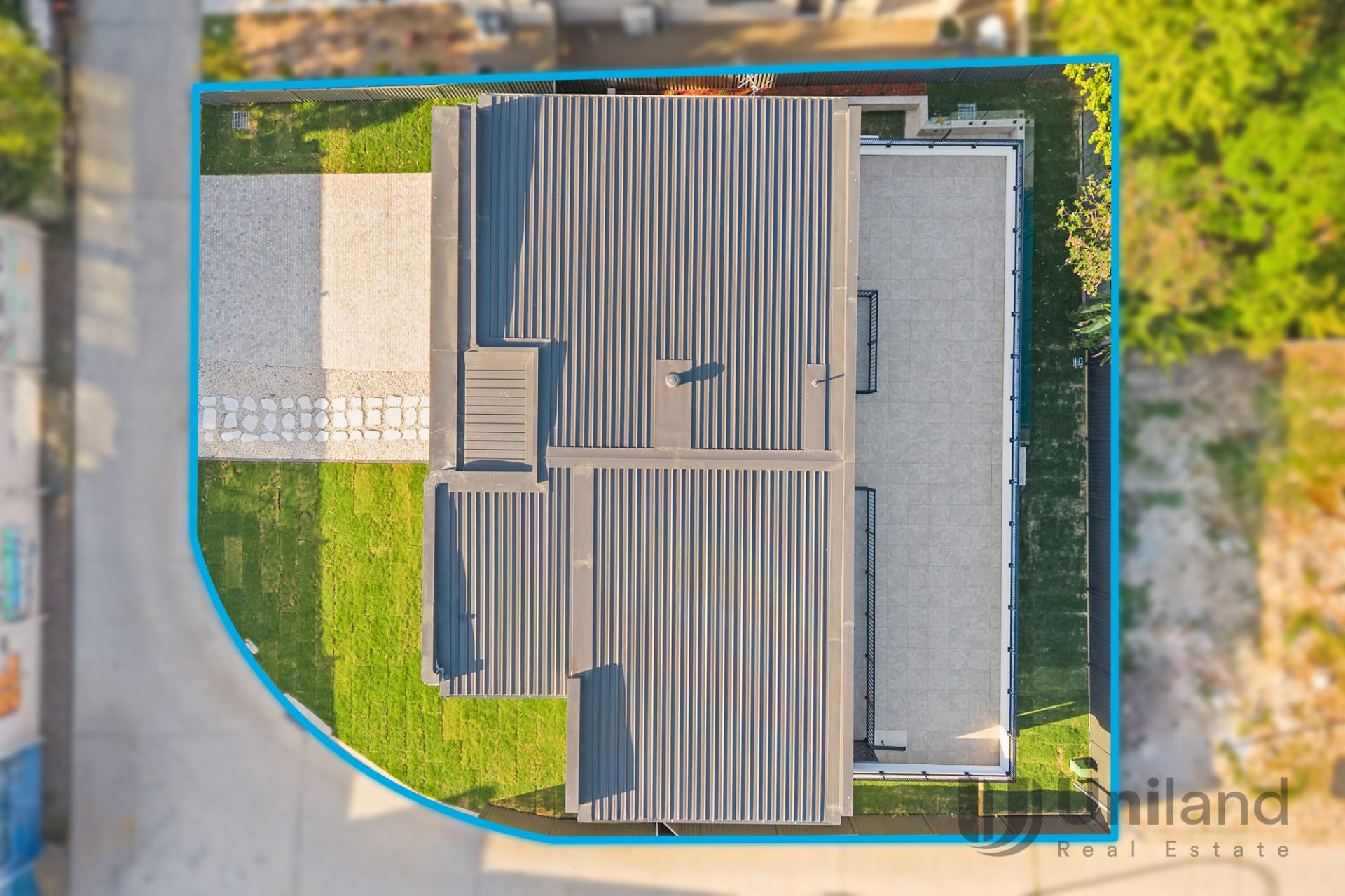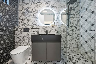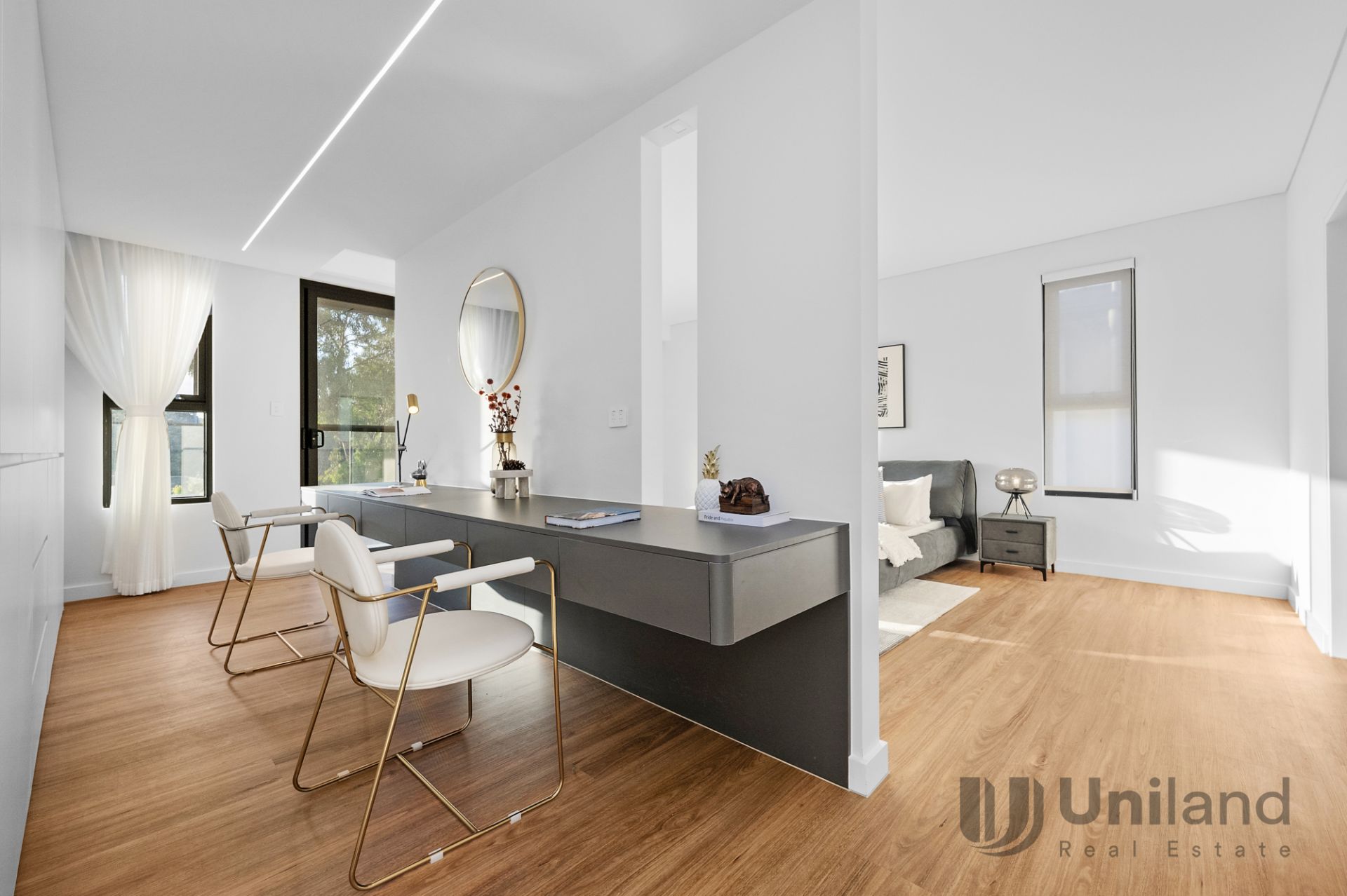 - Striking open-plan living with an impressive fluid linear design, highlighted by dramatic feature lighting and a natural stone waterfall island