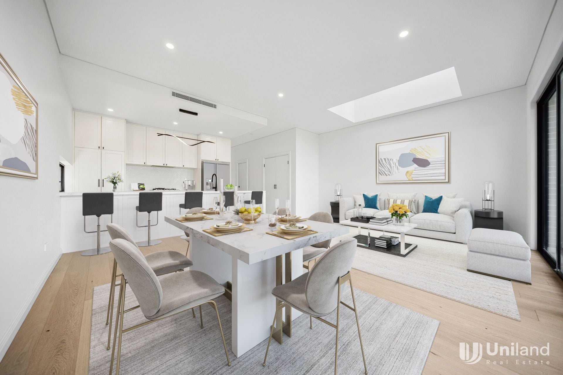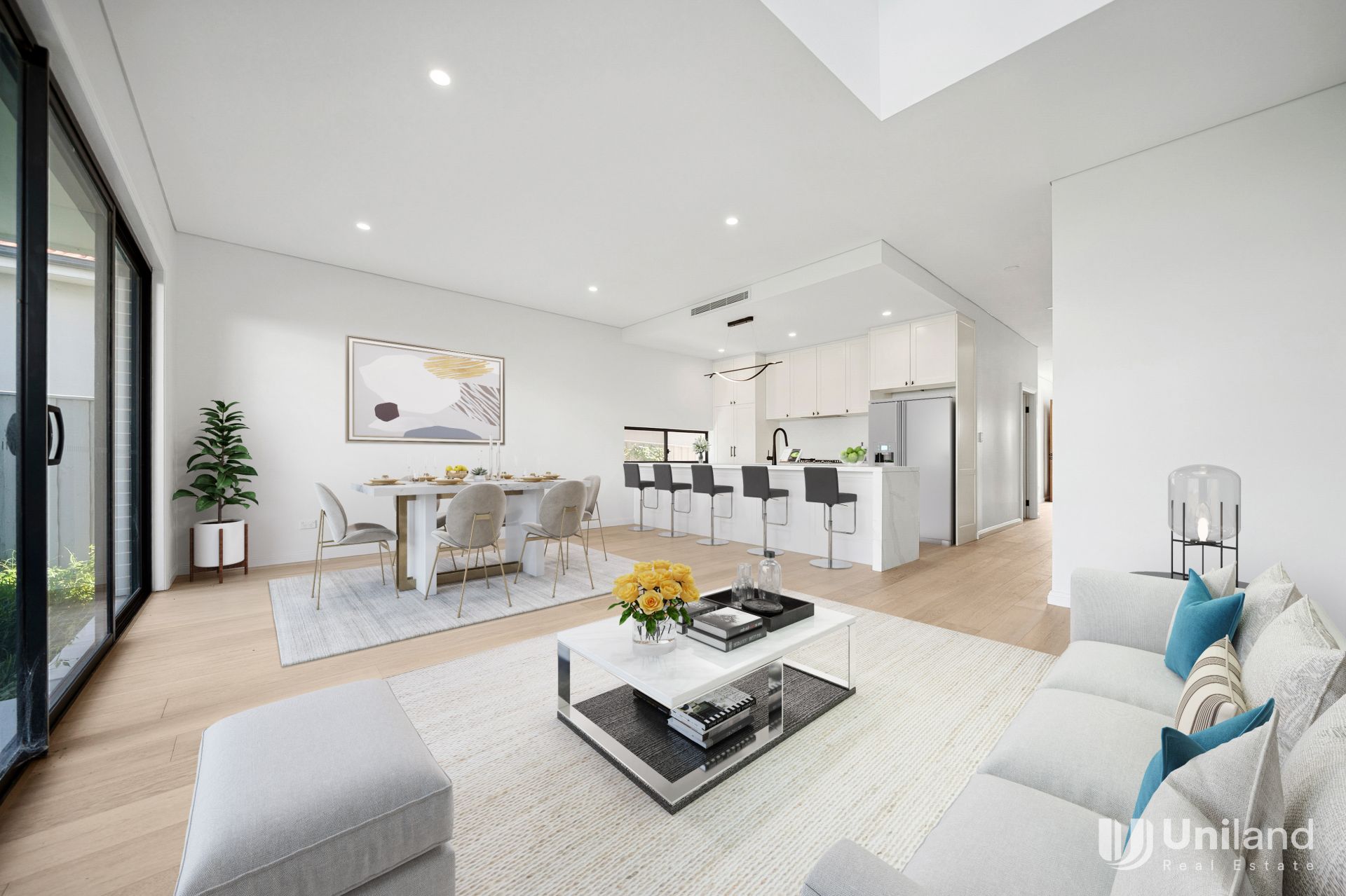 -Sun-drenched multi-living/dining zones are designed to keep the peace and help everyone relax.