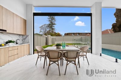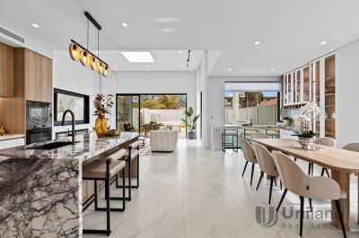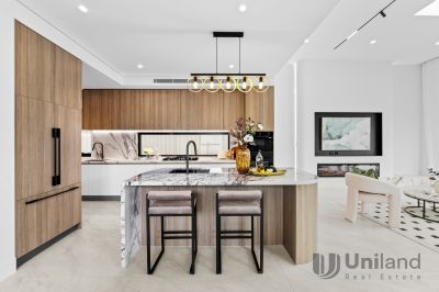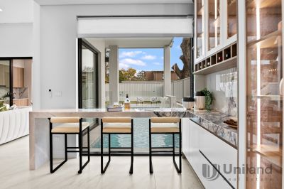 living zones converge in a stunning open plan living and dining domain framing the edge of a sublime inground pool. Scaled for entertaining, a gourmet kitchen fitted exclusively with Miele appliances integrates a hidden preparation area complemented by an outdoor gas kitchen and alfresco pavilion finished to perfection.