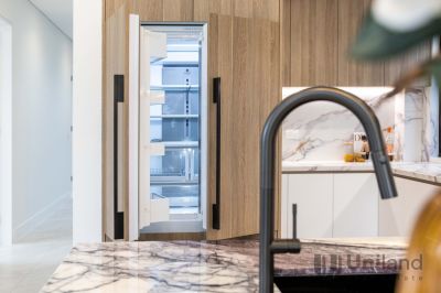 *Blending sophistication and function, a luxury kitchen with Miele appointments includes an integrated fridge and discreet preparation area, complete with a second sink