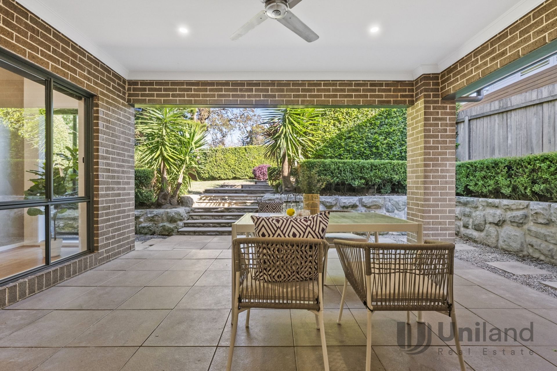 - Covered alfresco entertaining cooled with a ceiling fan flows to a refined garden setting with formal hedging and flat, pristine lawns