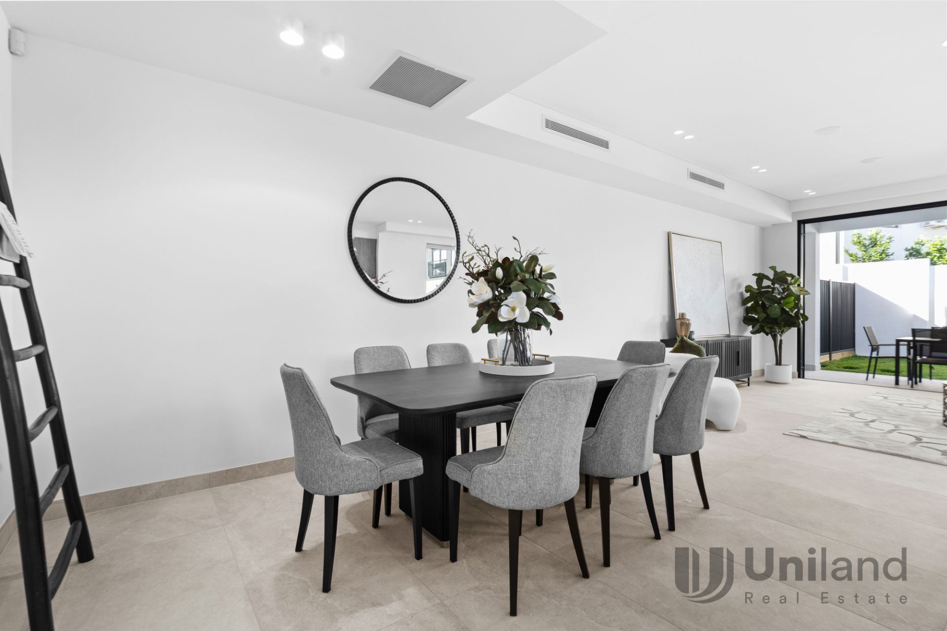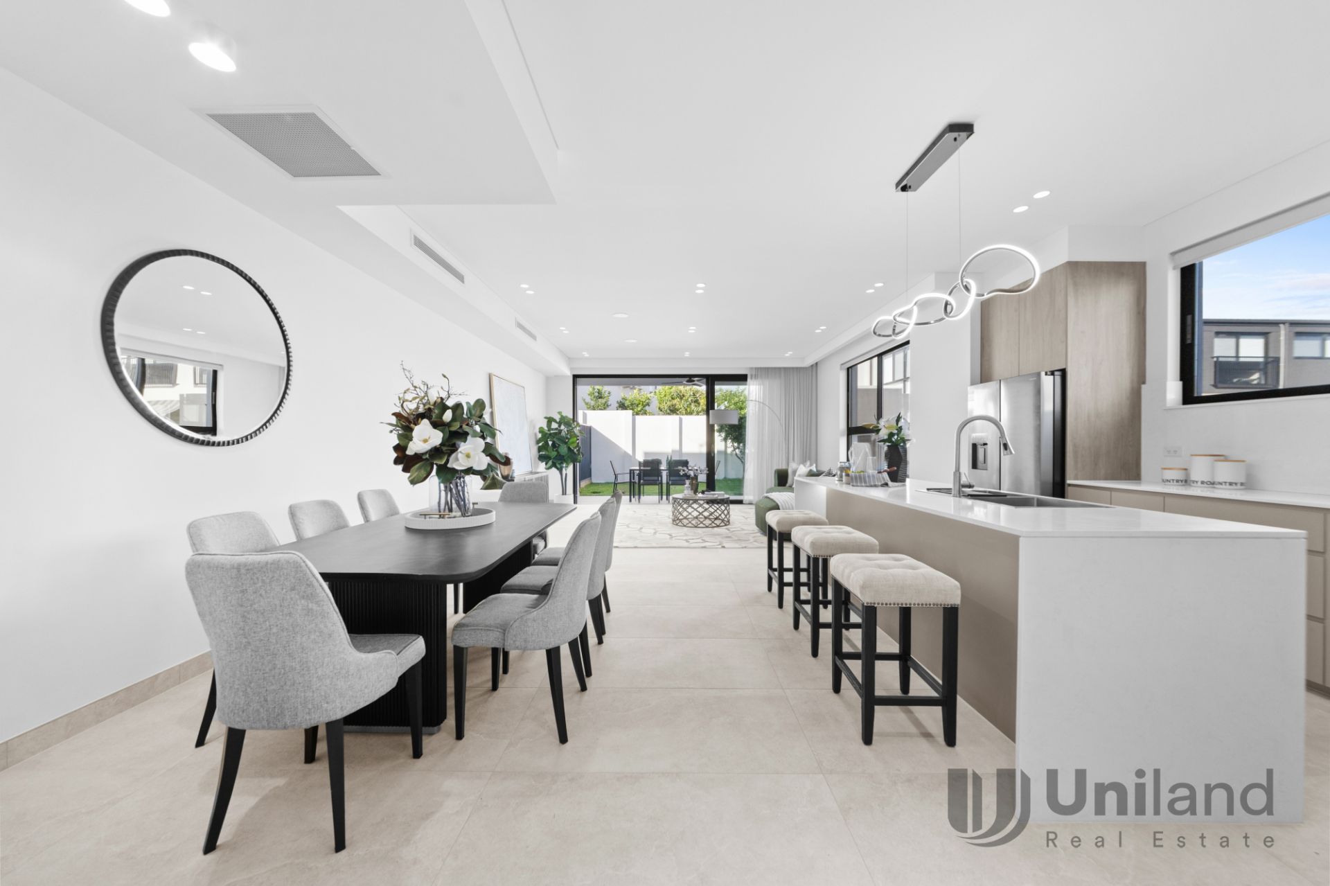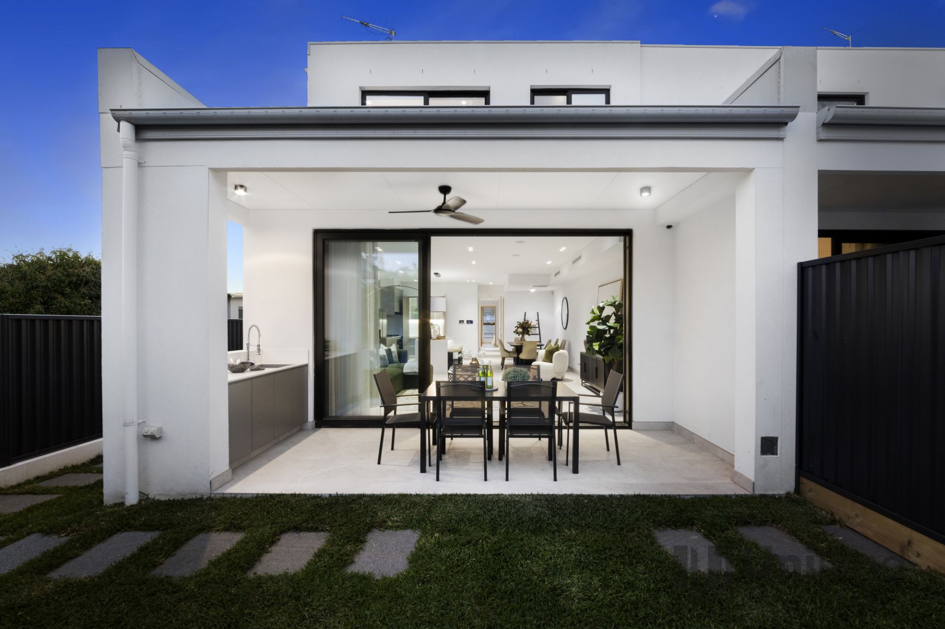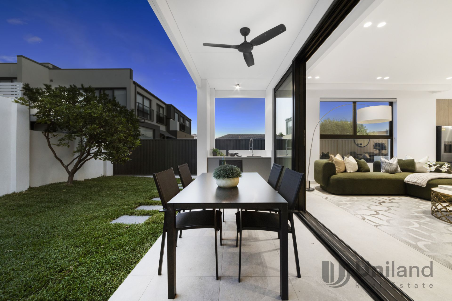 - Open plan lounge and dining designed for seamless entertaining, stacking glass sliders and invisible flyscreens transition to covered alfresco dining with ceiling fan and an outdoor preparation kitchen offering a gas connection