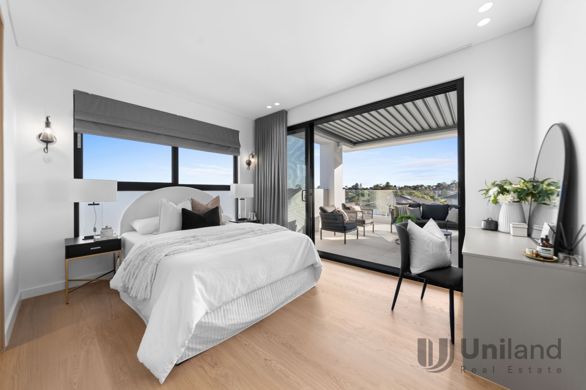 - Primary suite with robed corridor, built-in make-up station, custom French linen blinds and curtains, ensuite, and expansive terrace with a motorised louvred pergola delivering panoramic views to include Centrepoint Tower