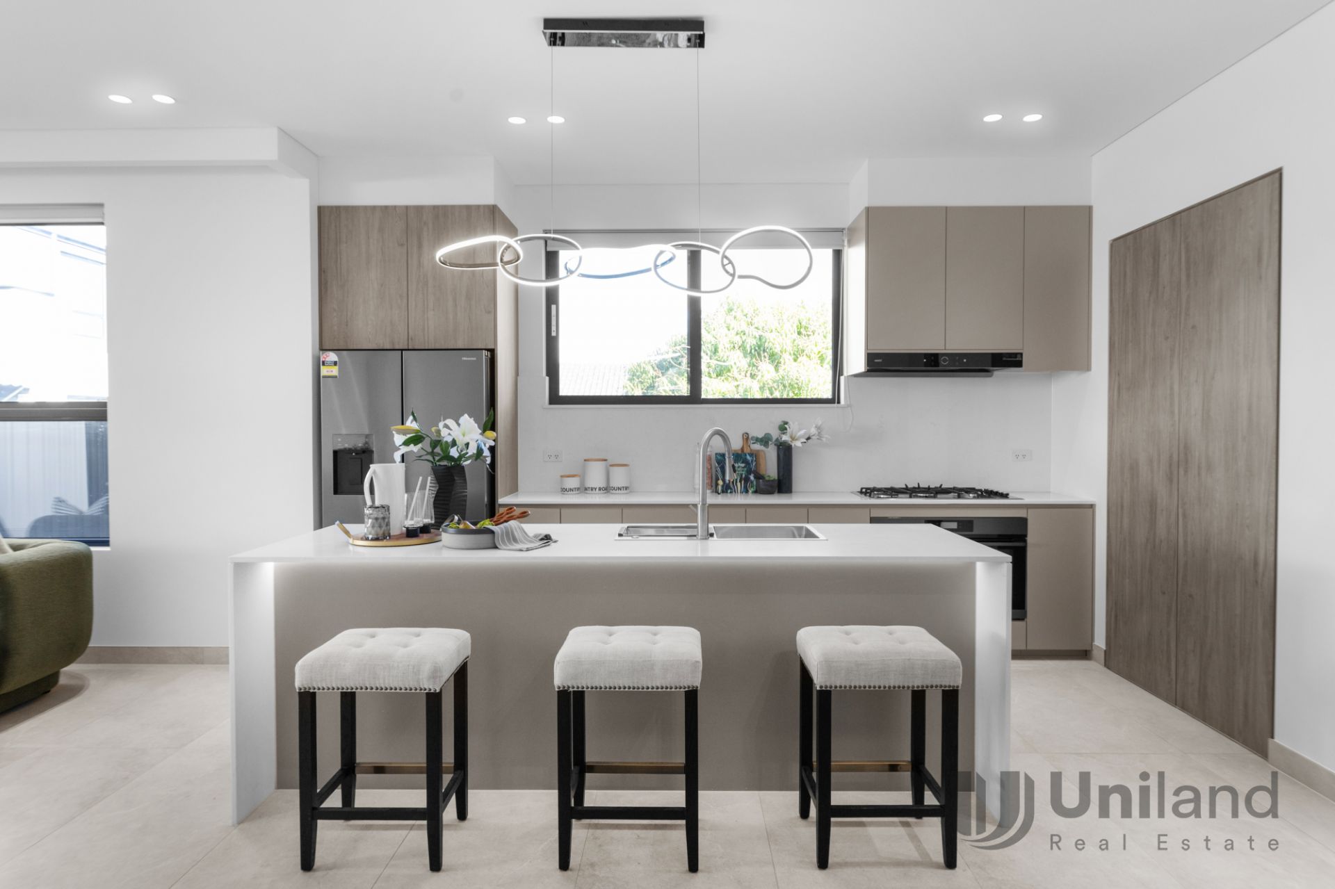 - Appointed with a powerful rangehood, Westinghouse 900mm oven, 5-burner gas cooktop and dishwasher, plumbed fridge connection