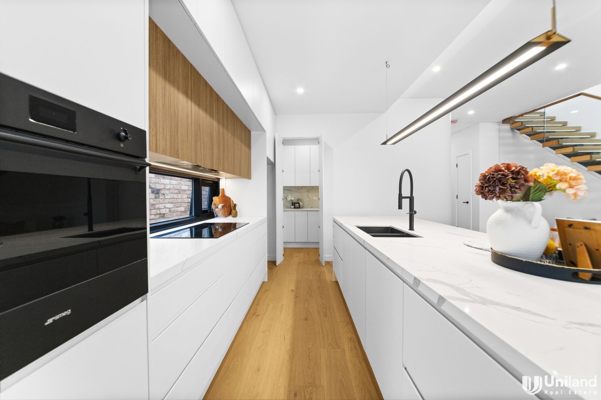 *Deluxe kitchen with long stone island bench and breakfast bar. It also features quality appliances and lovely pantry.
