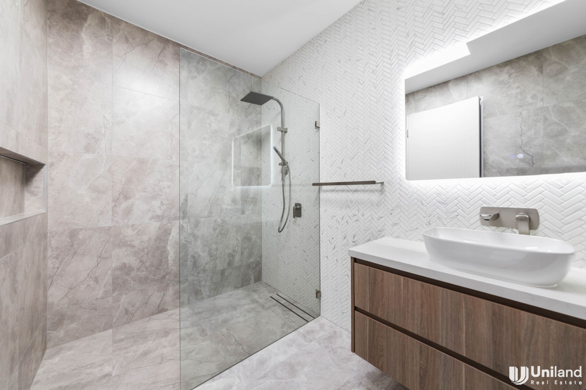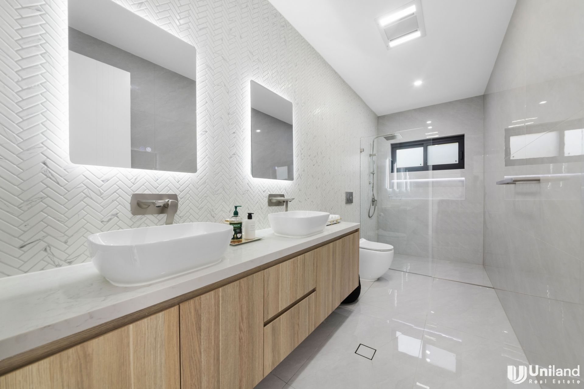 - Two primary suites, each with a walk-in wardrobe and ensuite bathroom, are differentiated by a balcony and wall mounted TV to one