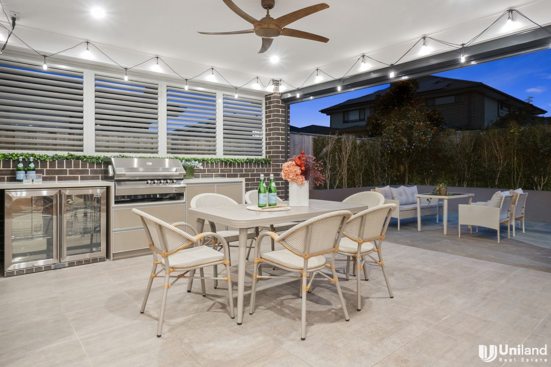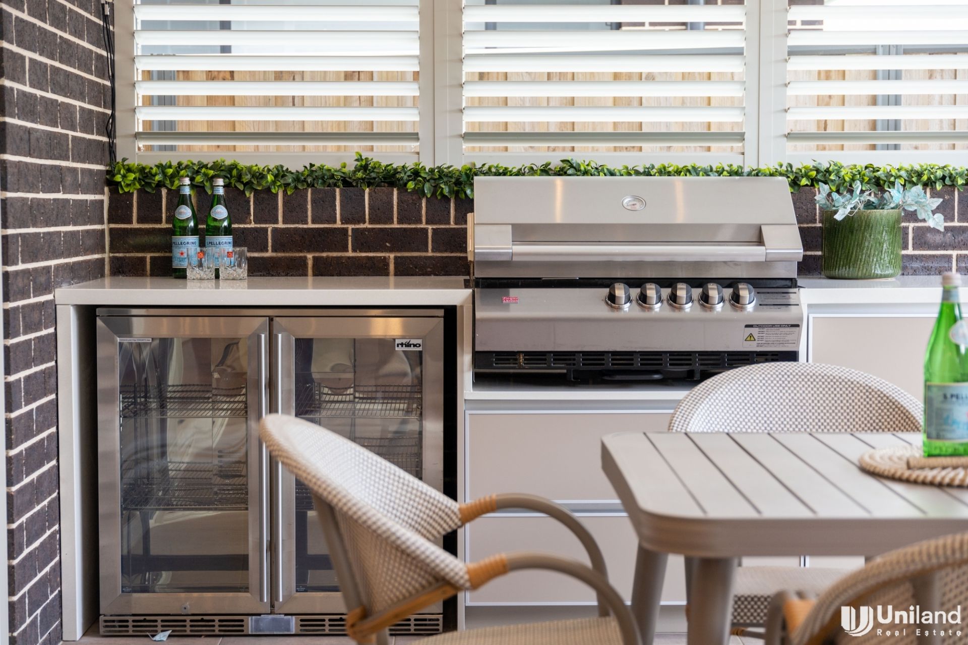 - Luxe appointments throughout alfresco entertaining include a gas barbecue, two bar fridges, and an automatic blind