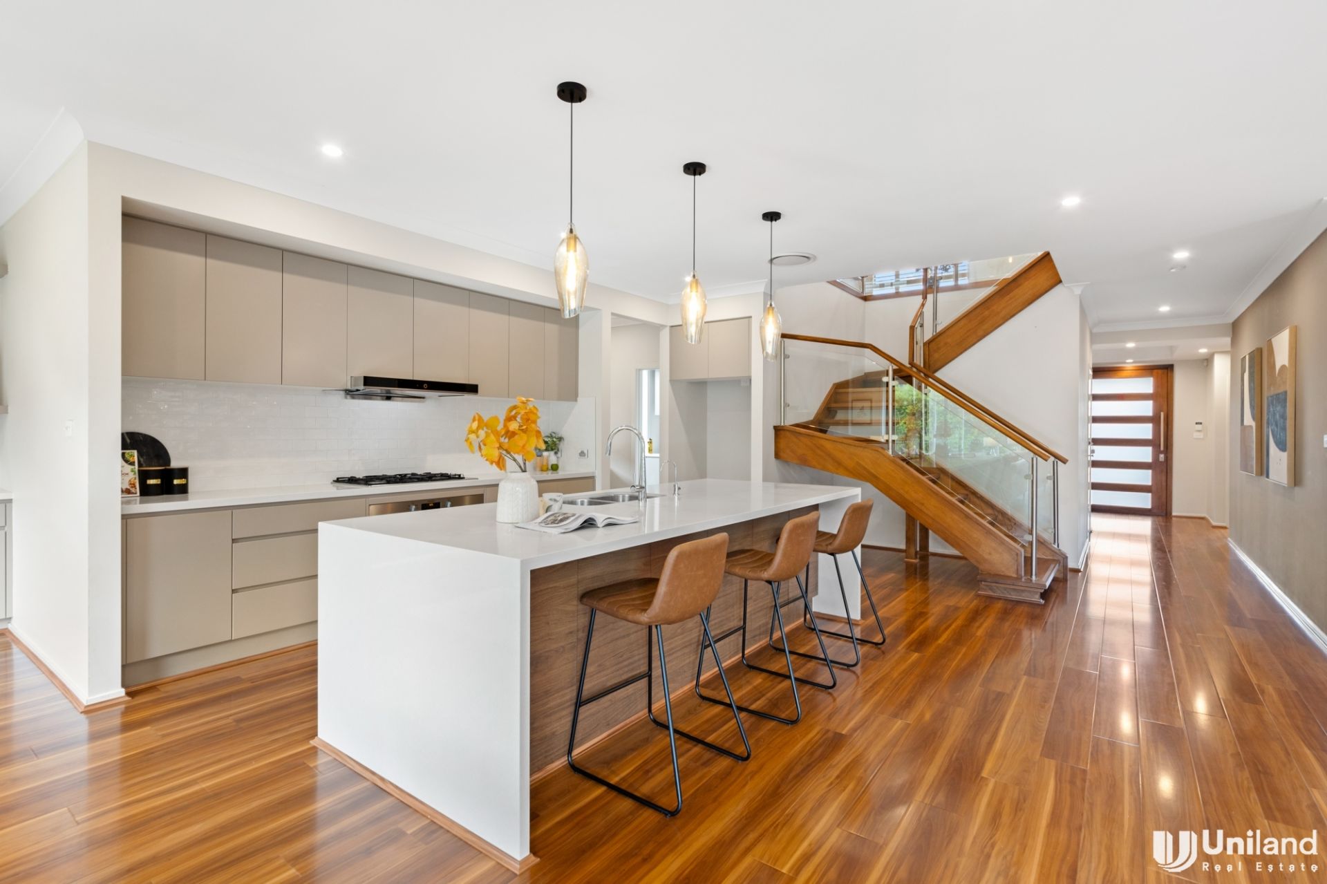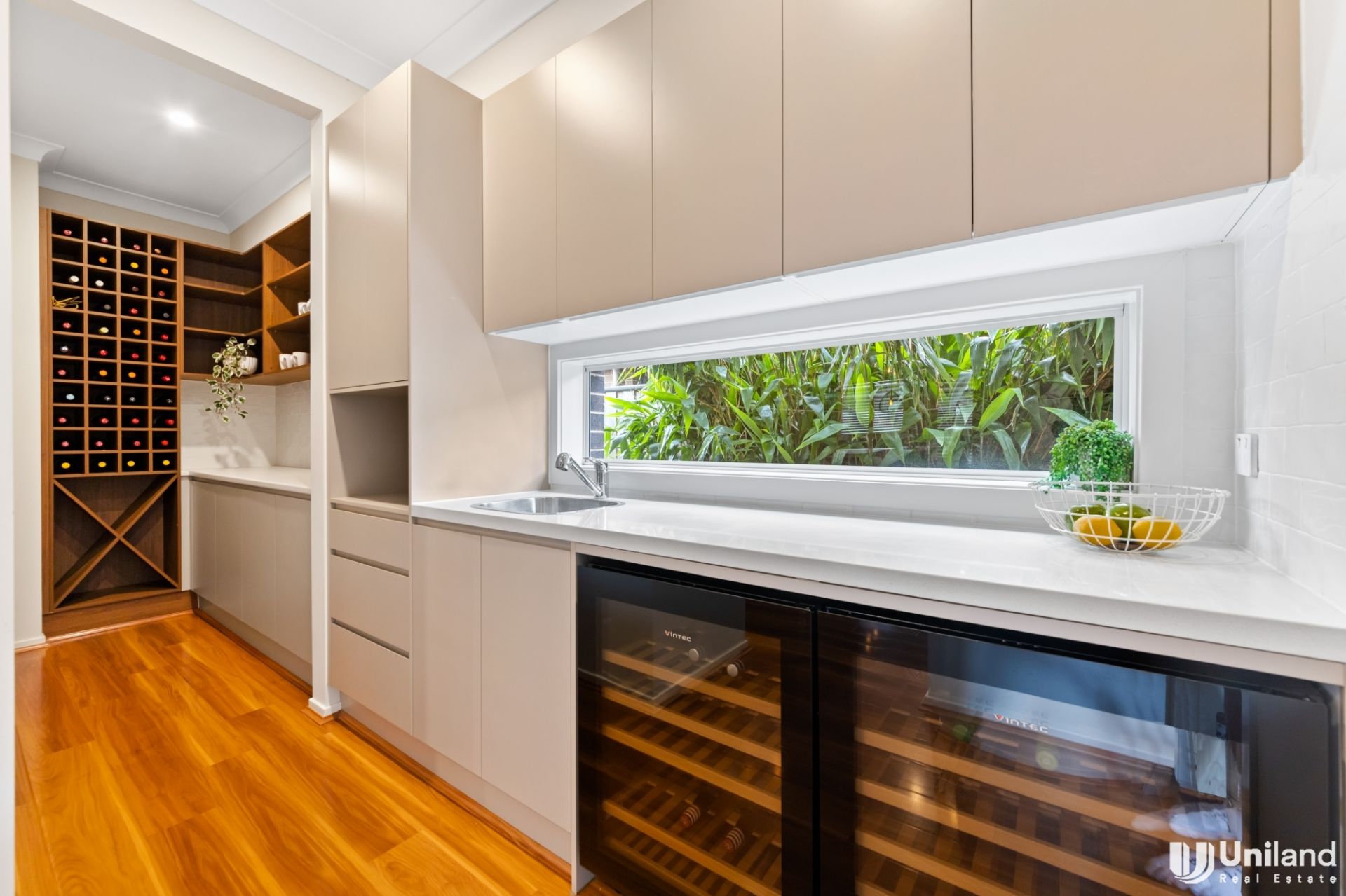 - Island kitchen with 40mm stone benchtops, 5-burner gas cooktop, 900mm oven and butler’s pantry boasting two built-in Vintec wine cabinets