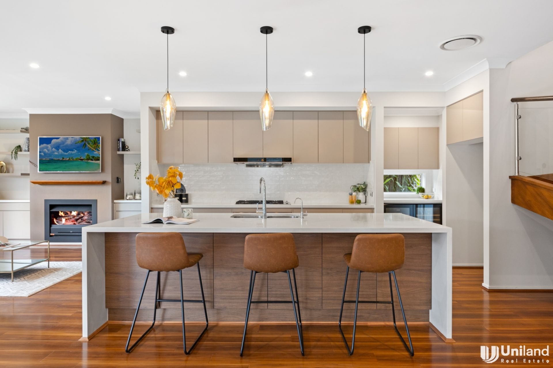 Elegantly centred for seamless connection, an expansive stone kitchen with butler’s pantry transitions through free-flowing living and dining spaces to exquisite outdoor living equipped with a built-in barbecue, and two bar fridges.